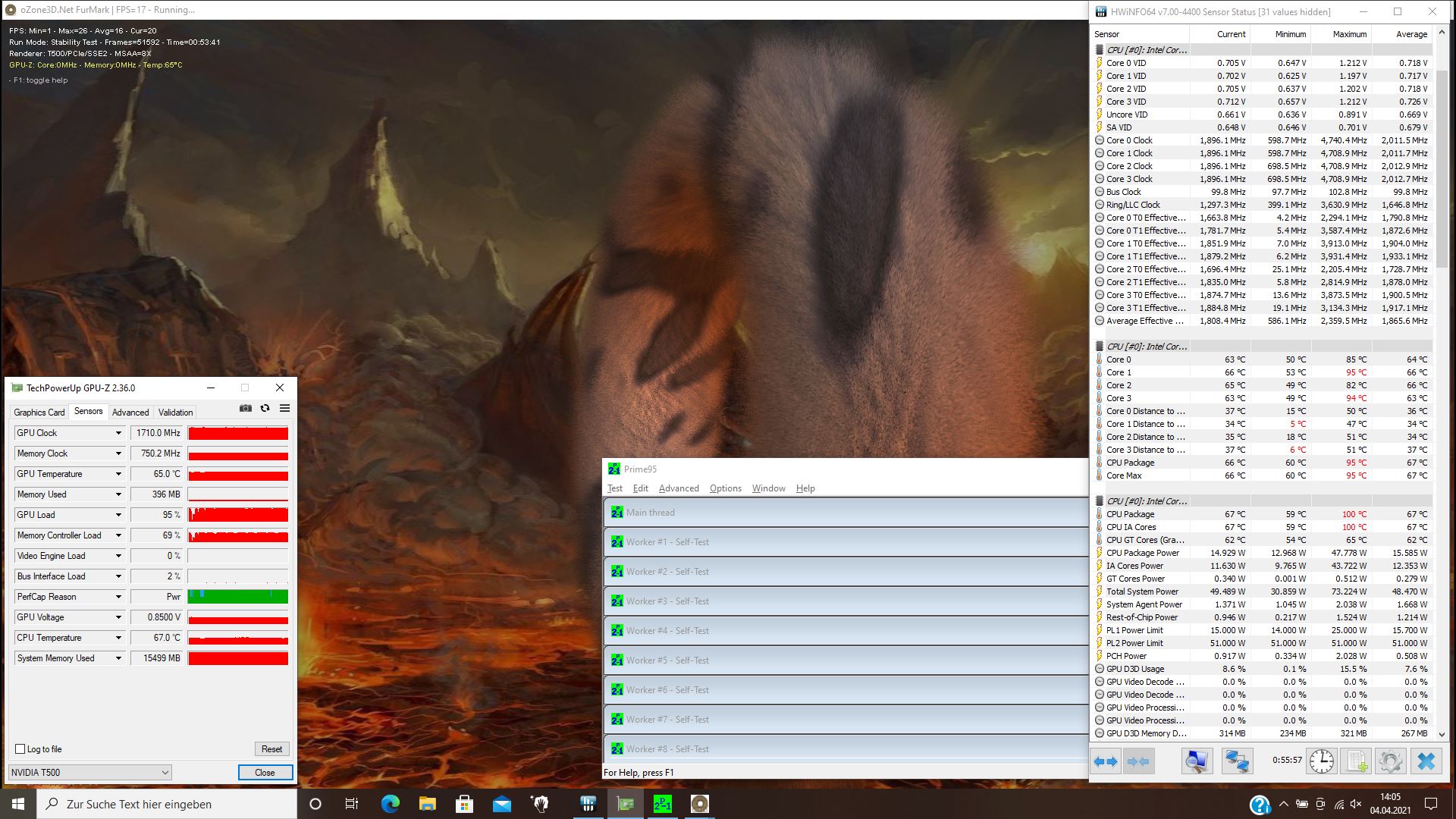 Während unseres circa einstündigen Dauerstresstests stiegen die Kerntemperaturen im Inneren des HP ZBook 14 G8 auf bis 95 °C. Dabei sanken die Taktraten kurzzeitig unter den Basistakt, wurden aber bis zum Ende des Testlaufs auf einen Durchschnittswert von circa 2 GHz stabilisiert. Das System lies sich dabei jederzeit flüssig bedienen, sodass Anwender keine Einschränkungen wegen zu hoher Temperaturen befürchten müssen.