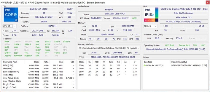 Der Core i7-1265U ist ein aktueller Alder-Lake-Chip (12. Generation) mit zwei schnellen Performance- und acht Efficiency-Kernen. Das Leistungspotenzial ist theoretisch auch sehr hoch, allerdings wird der Chip im ZBook Firefly 14 G9 durch das sehr geringe Power Limit von 12 Watt eingebremst, welches schon nach wenigen Sekunden einsetzt. Für einfache Aufgaben reicht das zwar aus, doch insgesamt ist die Leistung sogar etwas geringer als beim Tiger Lake Core i7-1165G7 des Vorgängermodells, wenn man alle CPU-Benchmarks zusammennimmt.