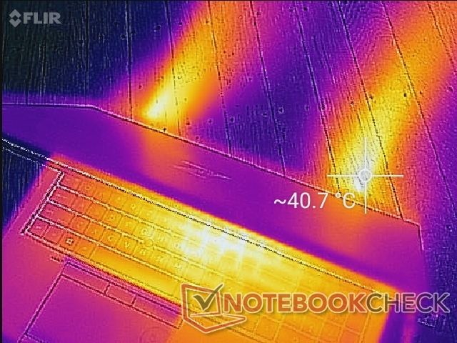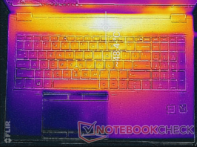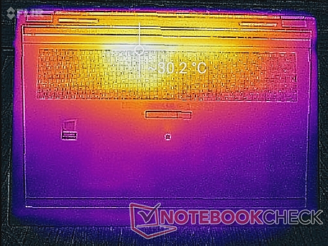 Die Hotspots können auf der Ober- und Unterseite bis zu 49 °C bzw. 60 °C erreichen. Zum Glück befinden sich diese Stellen im hinteren Bereich des Laptops, die der Nutzer eher selten berührt. Das Asus ProArt StudioBook Pro 15, welches mit der gleichen RTX-5000-Max-Q-GPU ausgestattet ist, wird noch wärmer und erreicht unter ähnlichen Umständen bis zu 66 °C.