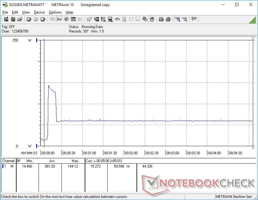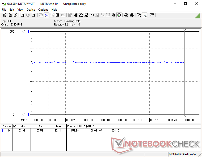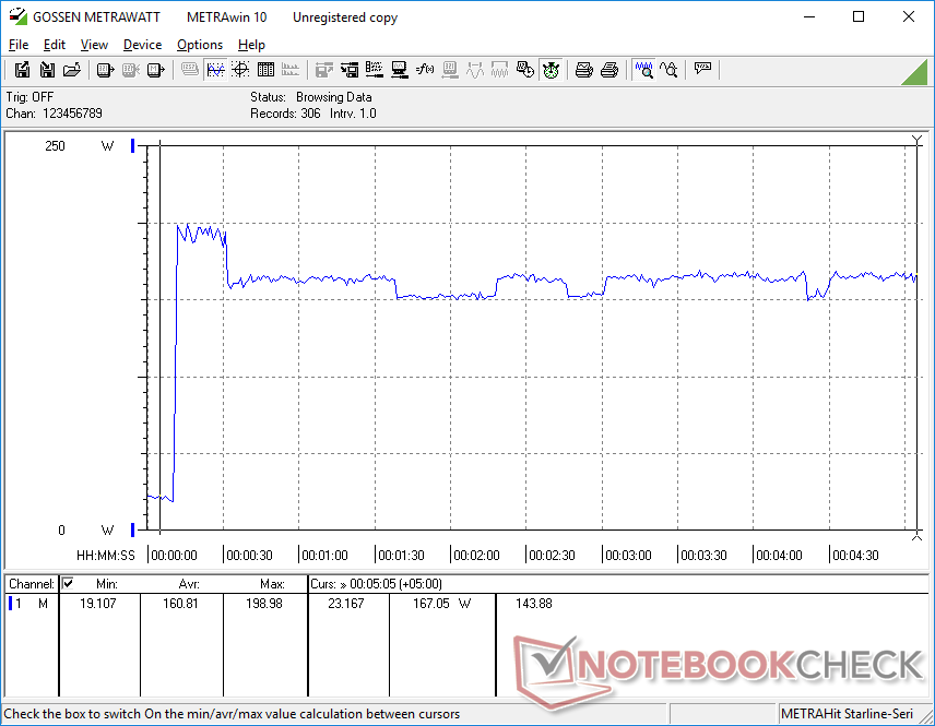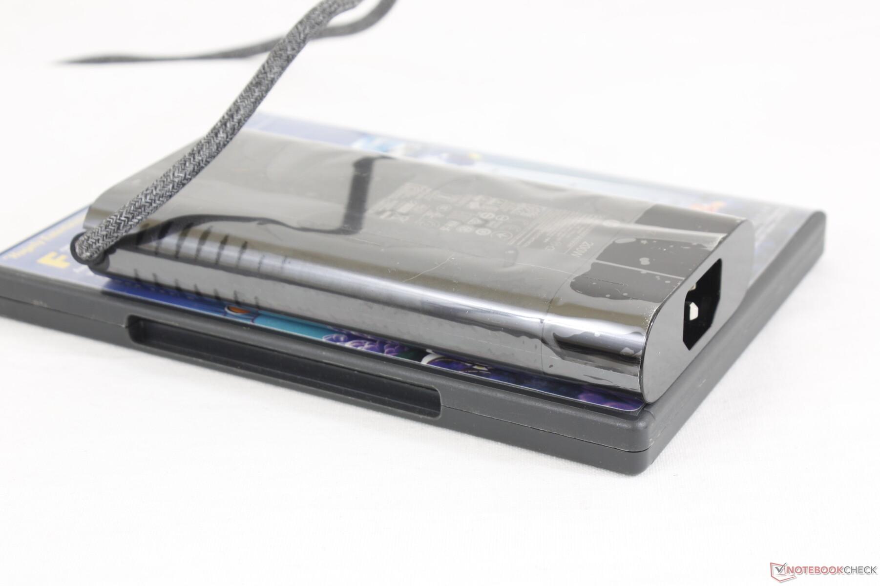 Wir haben eine maximale Energieaufnahme von 199 W gemessen. Dieser Wert wird, wie unsere Grafiken unten zeigen, allerdings nur kurzfristig aufrecht erhalten. Der Rückgang ist vermutlich auf thermische Gründe zurückzuführen. Das mittelgroße Netzgerät (~15 x 7,2 x 2,4 cm) hat eine Nennleistung von 200 W. Unter extremer Belastung verlangsamt sich das Ladeverhalten des Geräts. Dank des ausreichend dimensionierten Netzgeräts kommt es aber nicht zu einer Entladung, wie das bei manchen früheren Dell-Precision-Modellen der Fall war.