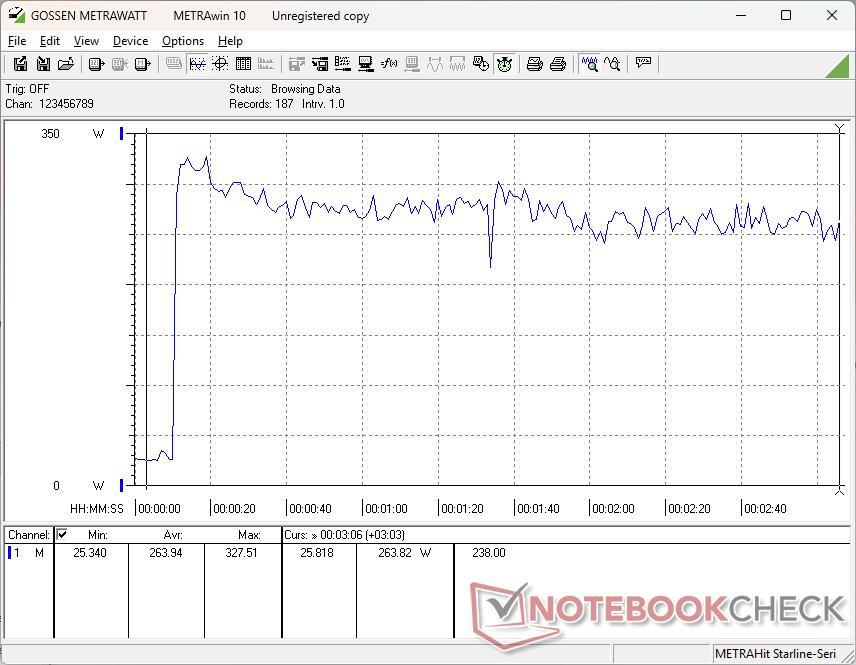 Das HP wird mit einem 330-W-Netzteil geliefert, während das Dell mit einem 280-W-USB-C-Netzteil daherkommt. Der maximale Verbrauch ist daher beim HP höher und erreicht in unseren Tests bis zu 328 W im Vergleich zu 281 W beim Dell, aber dieser hohe Verbrauch ist aufgrund thermischer Beschränkungen oder vorgegebener Obergrenzen nur von kurzer Dauer. Bei der gleichzeitigen Ausführung von Prime95 und FurMark erreichte der Verbrauch beispielsweise einen Spitzenwert von 328 W, bevor er sich schnell auf etwa 265 W stabilisierte, ähnlich wie wir es beim Dell beobachtet haben. Für die Leistung spielt das größere Netzteil mit 330 W also kaum eine Rolle.