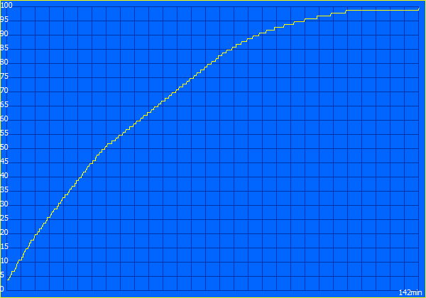 Ein vollständiger Ladevorgang dauert bei eingeschaltetem Gerät etwa 2,5 Stunden, allerdings stehen 50 % bereits nach 34 Minuten und 80 % nach 70 Minuten zur Verfügung.