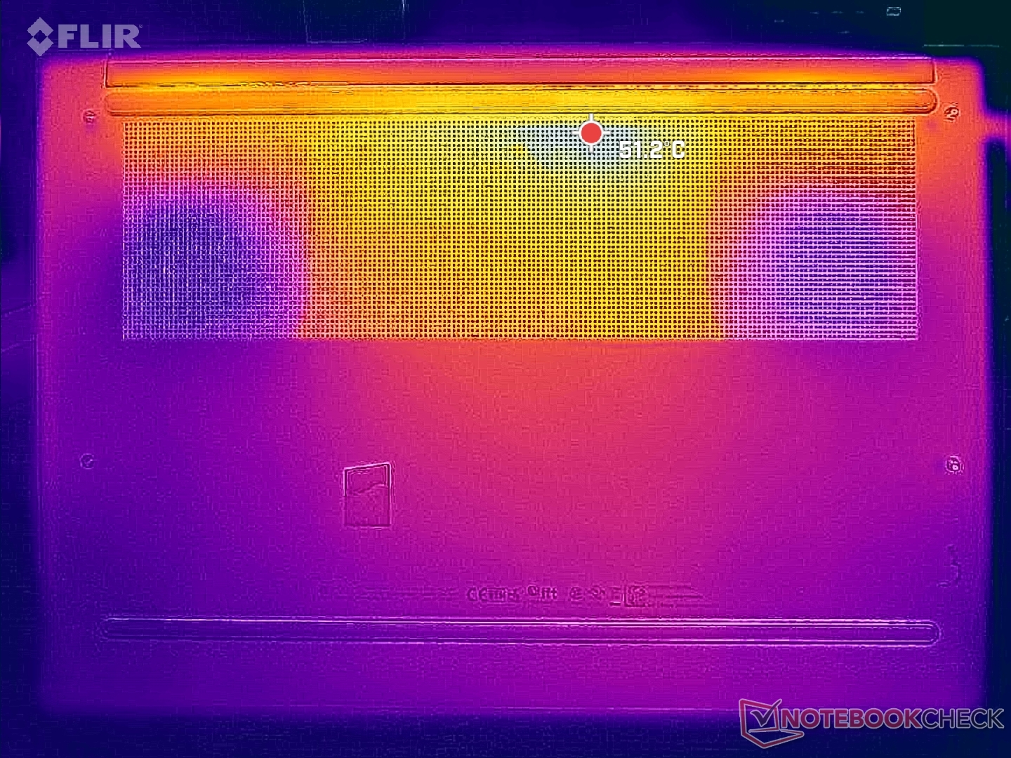 Die Oberflächentemperaturen sind an der unteren Rückseite des Geräts am wärmsten(über 48 °C). Glücklicherweise bleiben die Tastatur und die Handballenablagen mit bis zu 38 °C deutlich kühler und erträglicher.