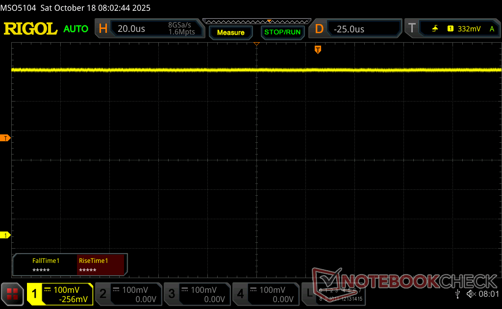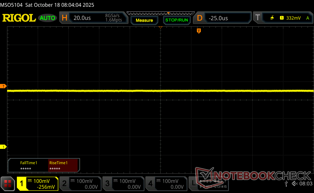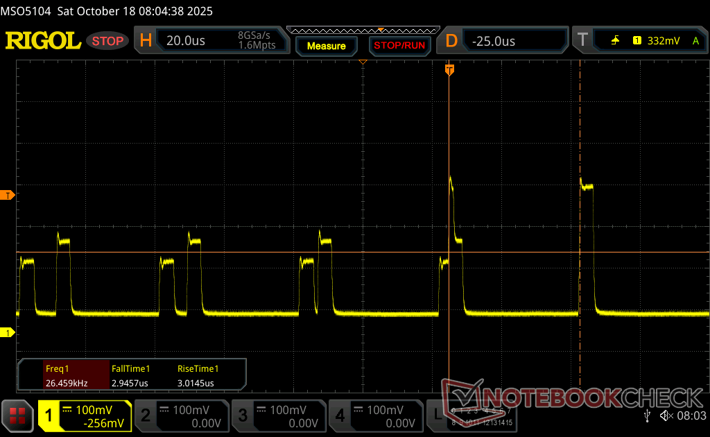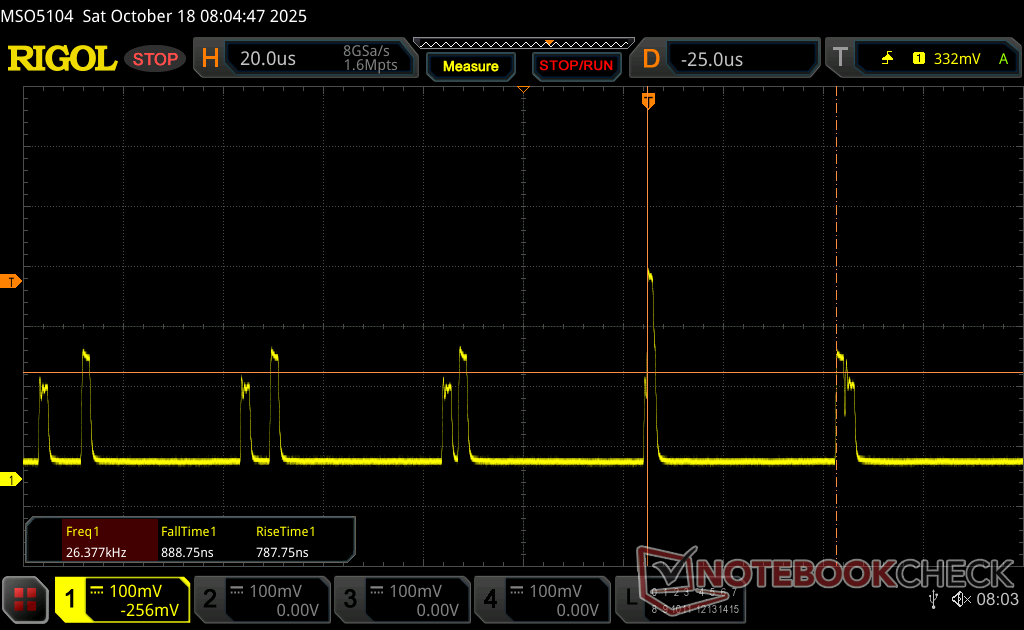 Das Display flackert mit 26536 Hz (im schlimmsten Fall, eventuell durch Pulsweitenmodulation PWM) bei einer eingestellten Helligkeit von 74 % und darunter. Darüber sollte es zu keinem Flackern kommen. Die Frequenz von 26536 Hz ist sehr hoch und sollte daher auch bei empfindlichen Personen zu keinen Problemen führen. Im Vergleich: 53 % aller getesteten Geräte nutzten kein PWM um die Helligkeit zu reduzieren. Wenn PWM eingesetzt wurde, dann bei einer Frequenz von durchschnittlich 8121 (Minimum 5, Maximum 343500) Hz. | |||