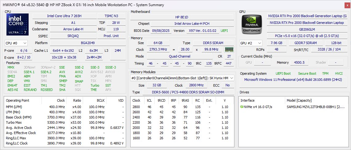 | HP ZBook X G1i 16 Intel Core Ultra 7 265H ⎘ NVIDIA RTX PRO 2000 Blackwell Generation Laptop ⎘ 64 GB RAM, 2048 GB SSD | Amazon: 1.493,73 € Bestpreis 2752.99€ MetaComp 2. 2871.8€ ITboost.de 3. 2918.93€ Easynotebooks.de | 2.2 kg | 23 mm | 16.00" 2560x1600 189 PPI IPS | |