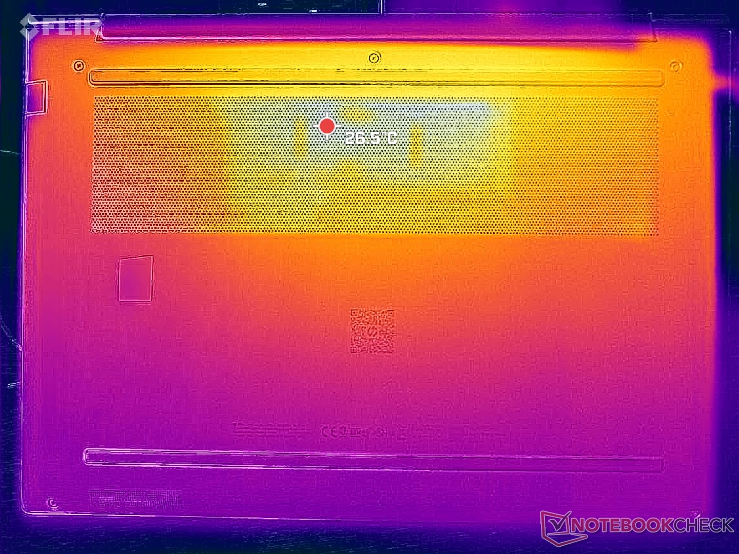 Die Oberflächentemperatur ist in der Mitte am wärmsten, wo sie bei anspruchsvoller Last über 36 °C erreichen kann, was deutlich kühler ist als das, was wir beim ThinkPad P16 Gen 2 oder Dell Precision 5690 gemessen haben.