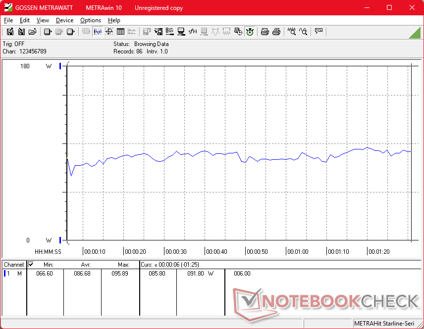 Der Verbrauch unter Last ist im Durchschnitt etwas höher als beim älteren AMD-betriebenen ZBook Power 16 G11 A. Allerdings ist unser ZBook X G1i 16 auch das schnellere und schlankere Gerät und so bleibt die hohe Leistung pro Watt erhalten.