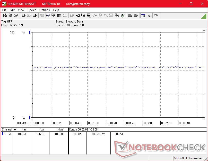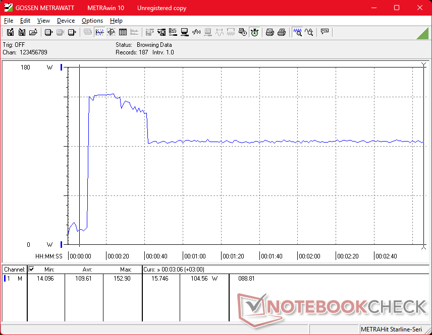 Mit dem kleinen (~13,8 x 6,5 x 2,2 cm) 150-Watt-Netzteil konnten wir eine vorübergehende maximale Leistungsaufnahme von 153 W messen, wenn CPU und GPU voll ausgelastet sind.