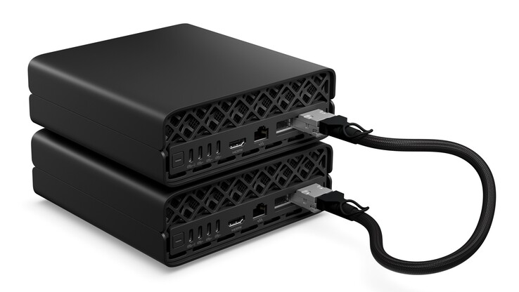 Reichen 128 GB Arbeitsspeicher nicht, können zwei ZGX Nano G1n mit einem speziellen Port mit einer Bandbreite von 200 Gbit/s miteinander verbunden werden, um den verfügbaren Speicher auf 256 GB zu verdoppeln. Abgesehen davon bietet der Mini-PC eine mäßige Anschluss-Auswahl, inklusive dreimal USB-C (20 Gbit/s), einmal HDMI 2.1a, einmal 10 Gbit/s Ethernet und einem vierten USB-C-Port, der zum Anschluss des mitgelieferten 240 Watt USB-C-Netzteils dient.