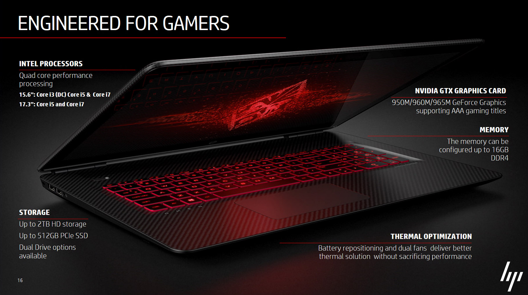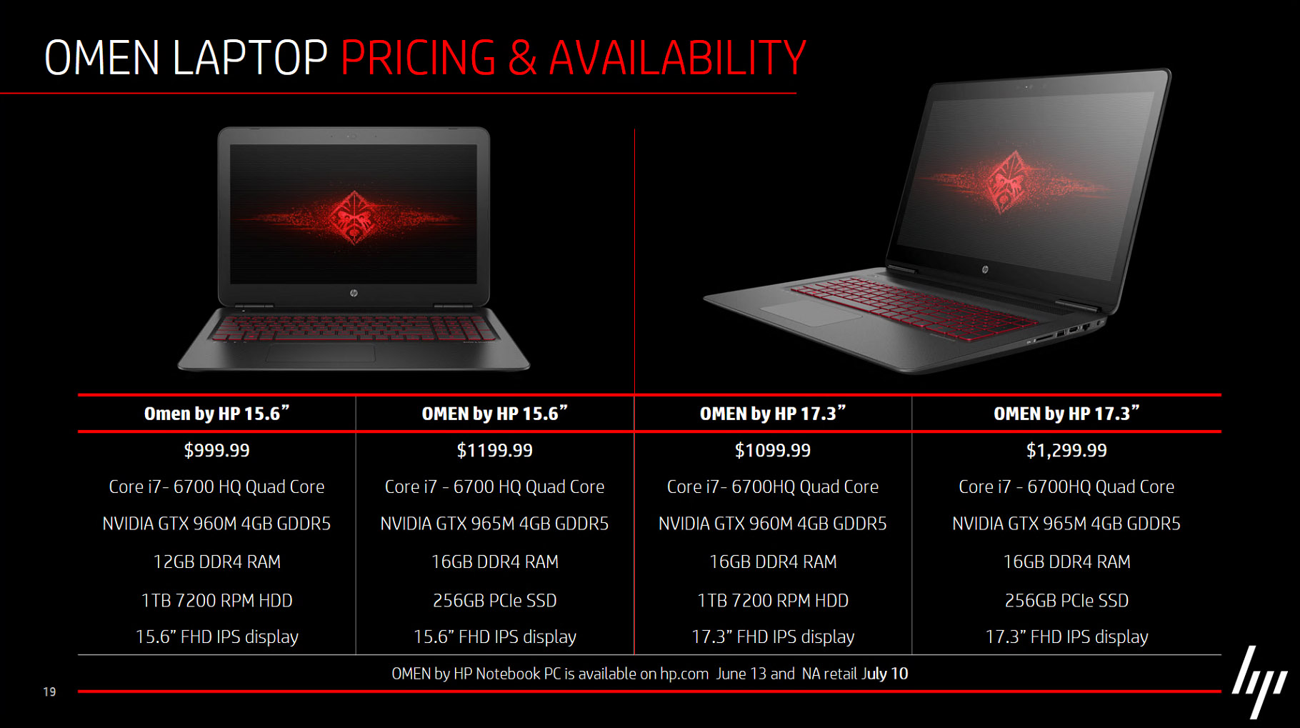 Zielbereich ist die Preisregion um bzw. knapp über 1.000 USD bzw. Euro, in dem HP seine Position mit im Vergleich zur Konkurrenz besonders günstigem Preis-Leistungsverhältnis festigen will. Unter der Haube wird man Intel Core i3 (Dualcore), i5 und i7-Quadcore Prozessoren beim 15-Zoll-Notebook sowie Core i5 und i7 beim 17er antreffen. Bei den Grafikkarten besteht die Wahl zwischen Nvidia Geforce GTX 950M, 960M oder Geforce GTX 965M. Arbeitsspeicher bis zu 16 GB DDR4 und Massenspeicher in Form von konventionellen Festplatten mit bis zu 2 TB Speicher oder PCIe SSDs mit bis zu 512 GB runden das Paket ab. Als Preise nennt HP für eine Konfiguration mit i7-6700HQ CPU, GTX 965M GPU, 16 GB RAM und 256 GB SSD sowie FHD-Display 1.199 USD, das vergleichbar ausgestattete 17-Zoll-Modell soll 1.299 USD kosten. Sobald verfügbare Modelle und Preise für den deutschen Markt bekannt werden, ergänzen wir diese an dieser Stelle.