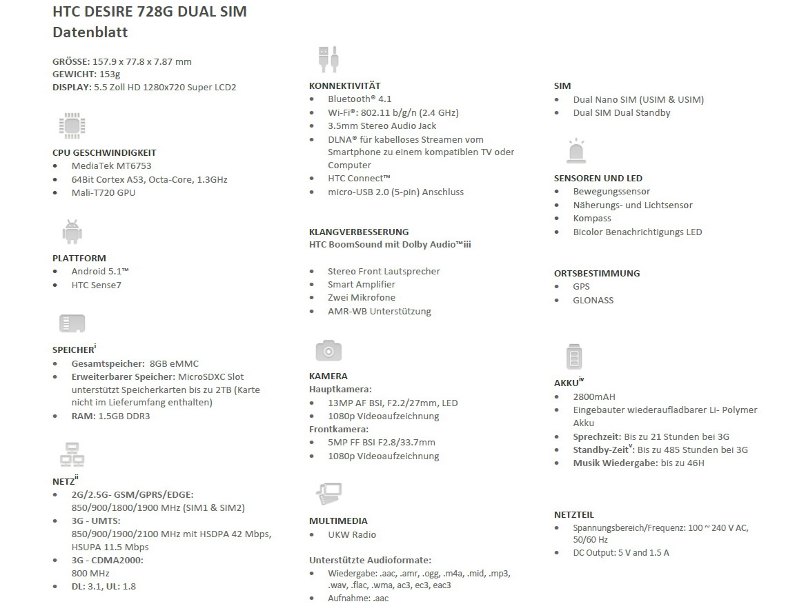 Die Technik des 3G/UMTS-Smartphones HTC Desire 728G Dual SIM umfasst einen ARM Cortex-A53 basierten 64 Bit MediaTek MT6753 8-Kern-Prozessor mit 1,3 GHz inklusive ARM Mali-T720 GPU, sowie 1,5 GB RAM und 8 GB eMMC. Via microSDXC-Speicherkarten lässt sich der interne Speicher noch erweitern (max. 2 TB). Die Auflösung des 5,5-Zoll-HD-Displays beträgt 1280 x 720 Pixel. Als Mobile-OS ist Android 5.1 Lollipop installiert.