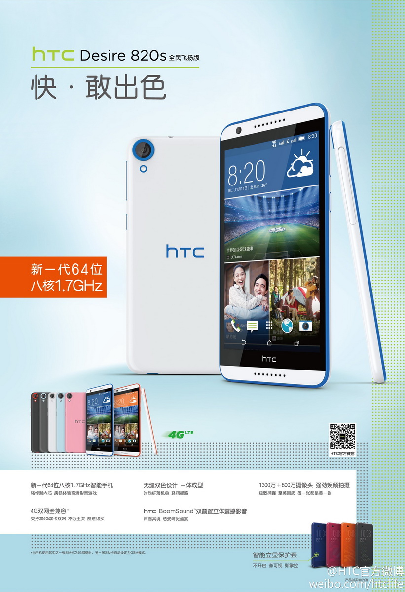 Der MTK-Chip ist ebenfalls ein 64 Bit Octacore-Prozessor, der mit 1,7 GHz getaktet ist. Zudem unterstützt das Desire 820s Dual SIM und 4G LTE. Die übrige Ausstattung scheint sich laut den bisher vorliegenden Informationen nicht vom 820er zu unterscheiden: 5,5 Zoll großes HD-Display (720p), 2 GByte RAM, 16 GByte eMMC sowie eine integrierte Frontkamera für Selfies mit 8 MPixeln und Blende f/2.4.