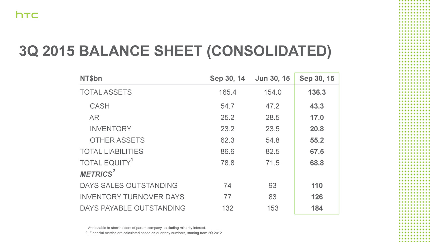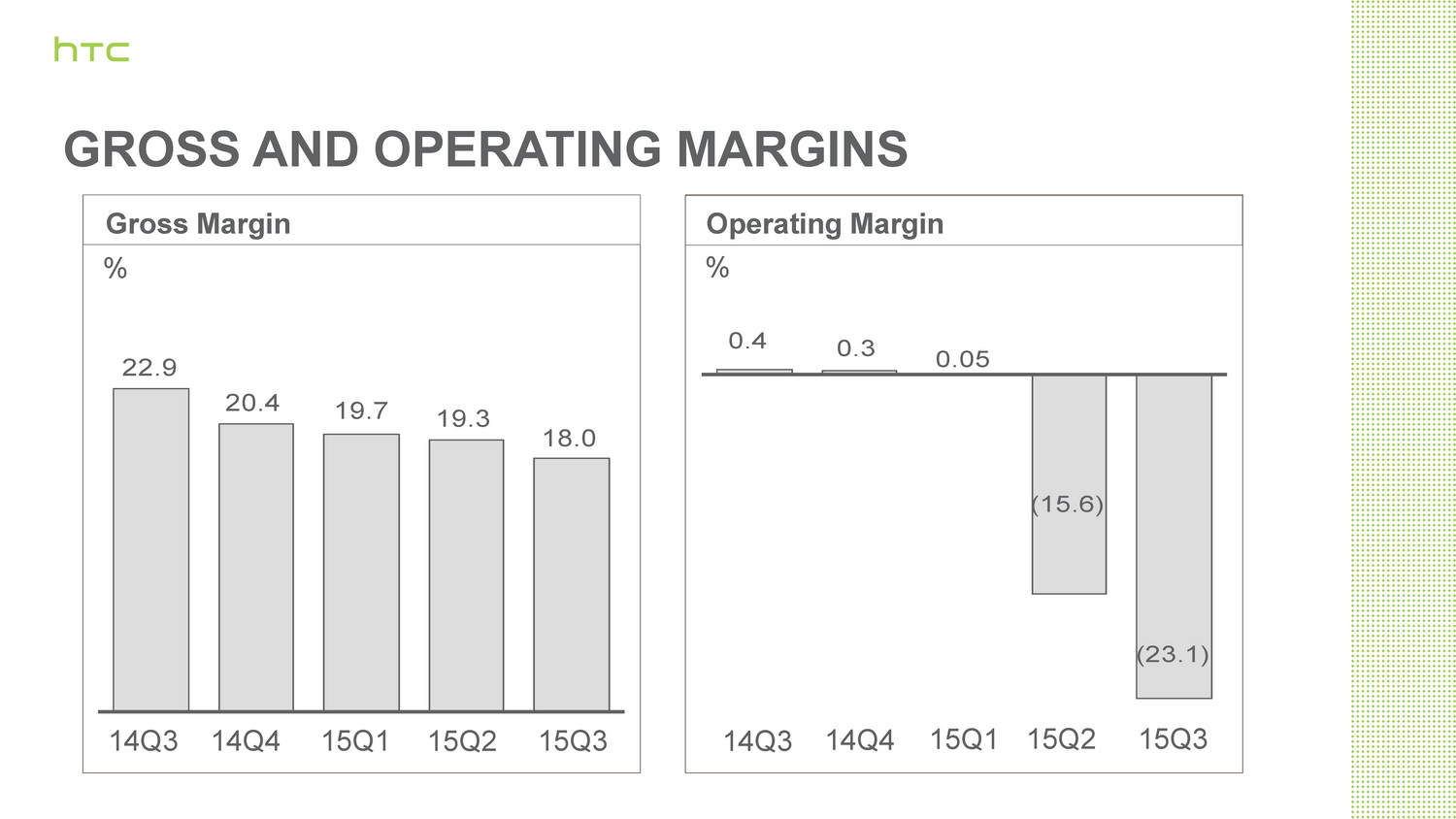 Der Umsatz von HTC hat sich im Jahresvergleich zum 3. Quartal 2014 nahezu halbiert. Wies HTC im Vergleichszeitraum 2014 noch einen Umsatz in Höhe von 41,9 Milliarden Taiwan-Dollar (1,172 Mrd. Euro) aus, so waren es in Q3/2015 nur noch 21,4 Mrd. (599,02 Mio. Euro). Der operative Verlust belief sich auf 4,9 Mrd. Taiwan-Dollar (137,16 Mio. Euro).