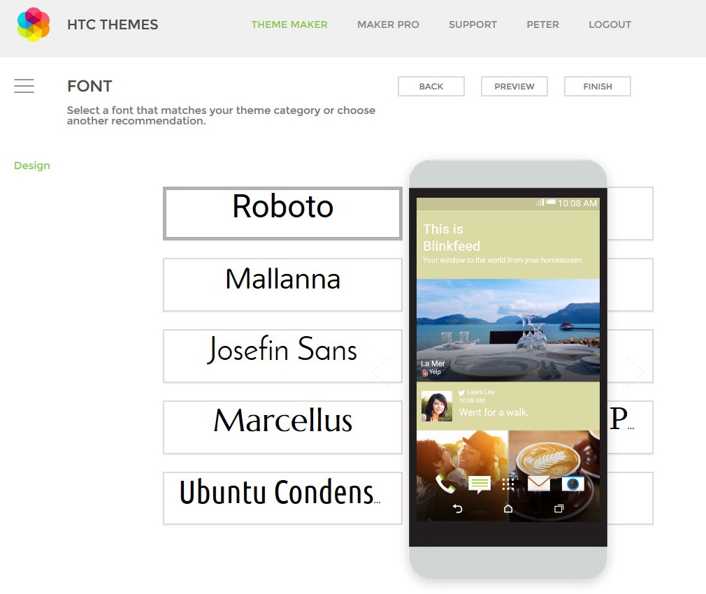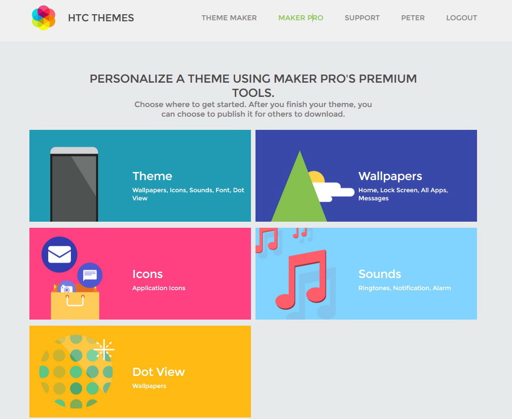 Auf der Webseite themes.htc.com hat der Kunde die Möglichkeit, seine eigenen Themes, Wallpaper und Klingeltöne zu schaffen. Damit bieten sich dem Nutzer zahlreiche Möglichkeiten, sein Smartphone zu personalisieren. So ist es möglich, eigene Fotos als Hintergrundbilder für den App-, Home- und Lockscreen hochzuladen und zu verwenden. Bei den Screens lassen sich auch Akzentfarben wählen und mit dem übrigen UI abstimmen.