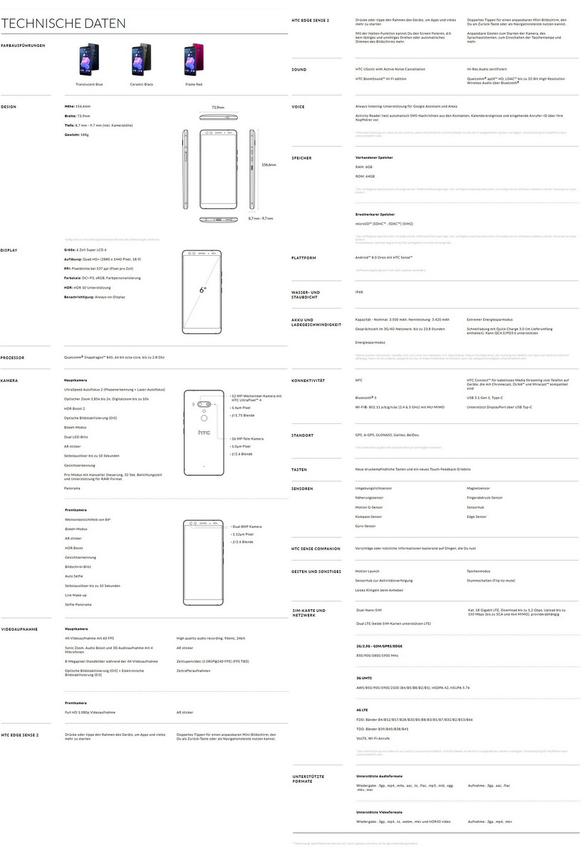 HTC spendiert seinem U12+ den Qualcomm Snapdragon 845 als Octacore-Prozessor, eine Dualkamera an der Rückseite mit 12-MP-Weitwinkel-Kamera, Blende f/1.75 und HTC UltraPixel 4 sowie 16-MP-Telekamera (f/2.6) und eine 8-MP-Dual-Selfiekamera mit f/2.6 vorne. Zu den weiteren Highlights zählen ein 6 Zoll großes Quad-HD+-Display mit 2.880 x 1.440 Pixeln im 18:9-Breitbildformat sowie Edge Sense 2 zur intuitiven Bedienung des U12+ mit einer Hand zum Fotografieren, Aufrufen von Sprachassistenten oder anderen Anwendungen.