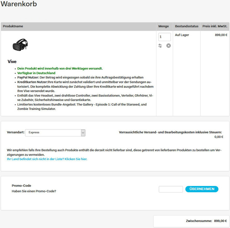 HTC stellt für sein Virtual-Reality-Headset Vive für kurze Zeit beim Kauf über Vive.com keine Versandkosten in Rechnung. Die VR-Brille ist aktuell auf Lager und kostet über den europäischen Vive-Store knapp 900 Euro. Laut HTC wird das Vive-Headset mit der Versandart Express innerhalb von drei Werktagen in Deutschland versandt.