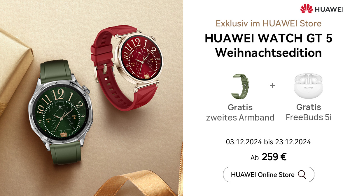 Die HUAWEI WATCH GT 5 startet ab 249 Euro und steht in verschiedenen Designs zur Wahl, neben der limitierten Weihnachtsedition beispielsweise auch als exklusives Style Set ebenfalls mit zweitem Armband und gratis Kopfhörern.