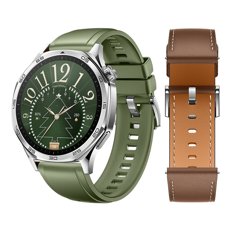 - WATCH GT 5 46mm Weihnachtsedition Edelstahlgehäuse mit grünem Fluorelastomer-Armband und braunem Lederarmband für 279 Euro