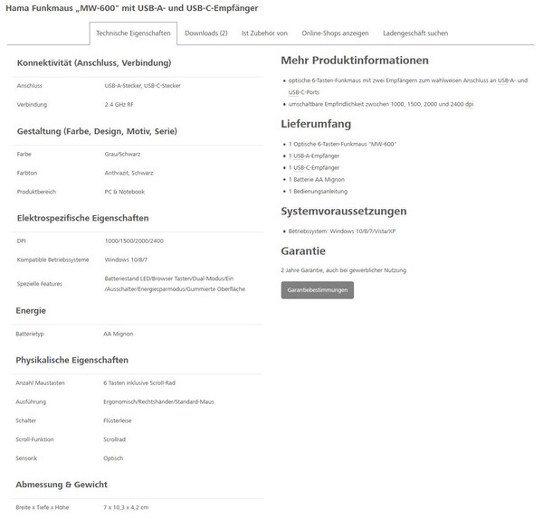 Die Hama MW-600 ist eine in nüchternem Grau/Schwarz gehaltene kabellose und optische 6-Tasten-Funkmaus, die mit einem USB-A- und einem USB-C-Empfänger geliefert wird. Die beiden USB-Funk-Dongles für das 2,4-GHz-Band lassen sich an zwei verschiedenen Rechnern einstöpseln und sich dann über eine kleine Taste an der Unterseite der MW-600 einzeln auswählen.