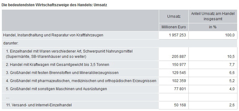 Nicht die Internetriesen wie Amazon waren im Jahr 2015 die bedeutendsten Wirtschaftszweige im deutschen Handel, sondern Supermärkte, SB-Warenhäuser und Verbrauchermärkte. In der offiziellen Statistik des Statistischen Bundesamts (Destatis) für 2015 taucht der Versand- und Interneteinzelhandel mit 50,17 Milliarden Euro erst auf Platz 11 auf.