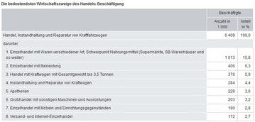 Am meisten Umsatz in Deutschland wurde im Einzelhandel mit Waren verschiedener Art, aber Schwerpunkt Nahrungsmittel getätigt: 205,89 Milliarden Euro. Das sind 10,5 Prozent des Gesamtumsatzes im deutschen Handel. Dahinter folgen mit 7,7 Prozent der Handel mit Kraftwagen bis 3,5 Tonnen und der Großhandel mit festen Brennstoffen und Mineralölerzeugnissen mit 6,6 Prozent.