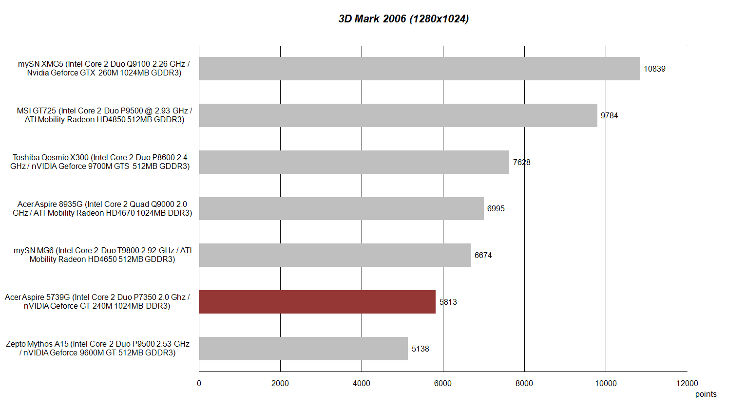 In diesem Zusammenhang muss aber erwähnt werden, dass das vorliegende Notebook mit der Intel P7350 CPU bei weitem nicht an die Prozessoren der Vergleichsgeräte heran kommt, und eine stärkere CPU hier mit Sicherheit für ein besseres Ergebnis sorgen würde. Ein zweiter Punkt ist, dass die GT 240M Grafikkarte im Aspire 5739G nur über DDR3 Videospeicher verfügt. Dieser bremst ebenso und bleibt damit hinter der Performance anderer Grafikkarten, ausgestattet mit dem schnelleren GDDR3 Speicher (32-Bit Anbindung), zurück. Bei Top-Ausstattung dürfte die GT 240M damit noch etwas Boden nach oben hin gut machen.