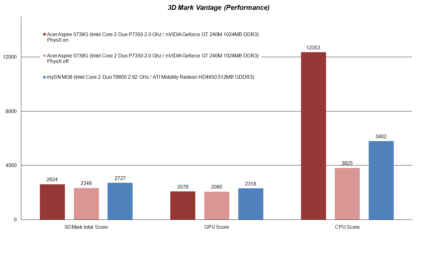 Auch der aktuelle 3D Mark Vantage Benchmarktest unterstützt PhysX, was den Nvidia Grafikkarten natürlich einen Vorteil einräumen kann. Im Detail erreichte das 5739G mit PhysX 2624 Punkte im Gesamtscore. Im Vergleich zum Durchlauf ohne PhysX ist das ein Plus von 26%. Gut zu erkennen in den Einzelergebnissen ist auch der Benefit des CPU-Scores von PhysX, auch im Vergleich zur HD4650.