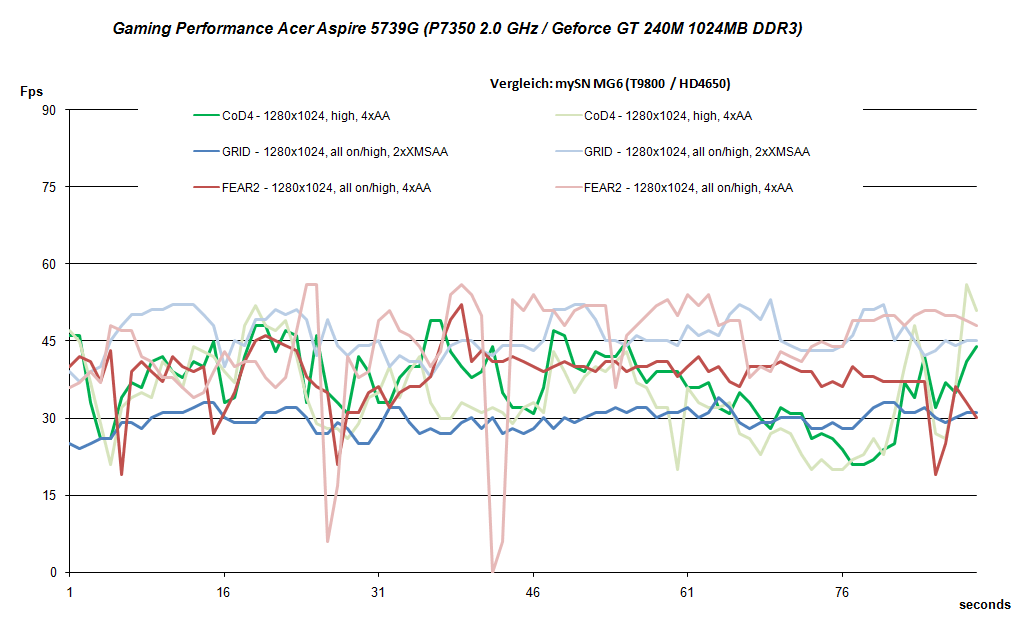 Beim standardisierten Durchlauf einer Passage im ersten Single-Player Level kann man gut erkennen, dass die Framerate mit der des mySN MG6 (ausgestattet mit HD4650 Grafik) annähernd ident ausfällt. Abschnittsweise liegt die GT 240M voran während in anderen Teilen die HD4650 die Nase vorne hat. Insgesamt fällt der Unterschied aber unwesentlich aus.