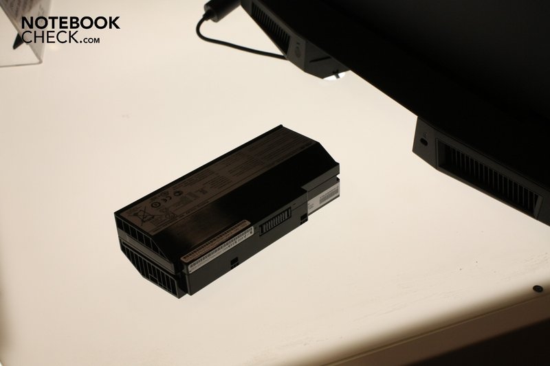 Der 8-Zellen Lithium-Ionen-Akku stammt von Asus selbst, ist zwischen den gigantischen Lüftern auf der Rückseite verbaut und hat eine Kapazität von 78 Wh. Das Netzteil ist auf maximal 120 Watt ausgelegt, es ist also davon auszugehen, dass das System unter Volllast mehr als 78 Watt verbraucht und damit keine Stunde ohne Strom durchhält.