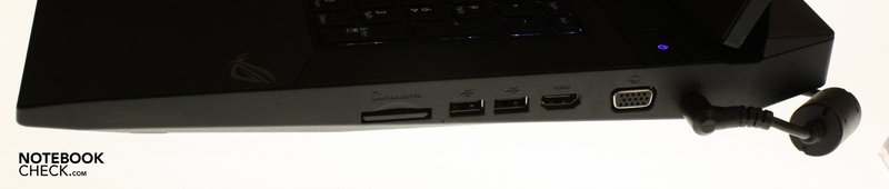Asus verbaut alle nötigen Ports, mehr aber auch nicht. So finden sich an der linken Seite von vorne nach hinten: Der Kopfhörerausgang, der Mikrofoneingang, ein USB 2.0-Port, je nach Ausstattung das Blu-ray-Laufwerk oder der DVD-Brenner, ein weiterer USB-Port, sowie die Gigabit-LAN-Schnittstelle.