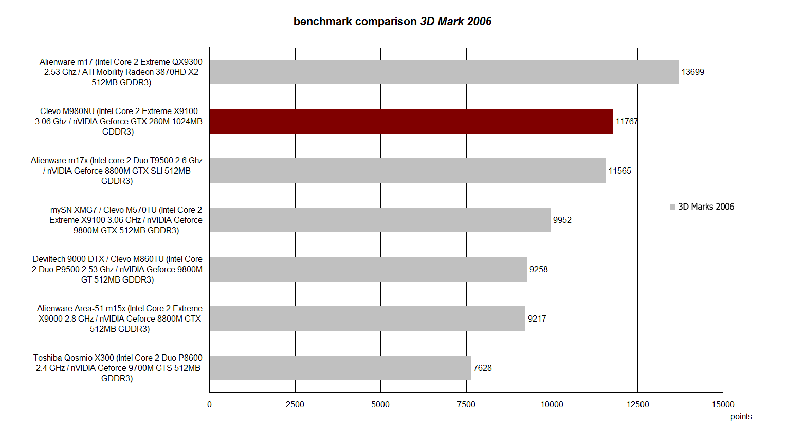 Mit 11767 Punkten im 3D Mark 2006 Benchmarktest kann die Geforce GTX 280M mit unserem Testsystem ebenso ein respektables Ergebnis einfahren.