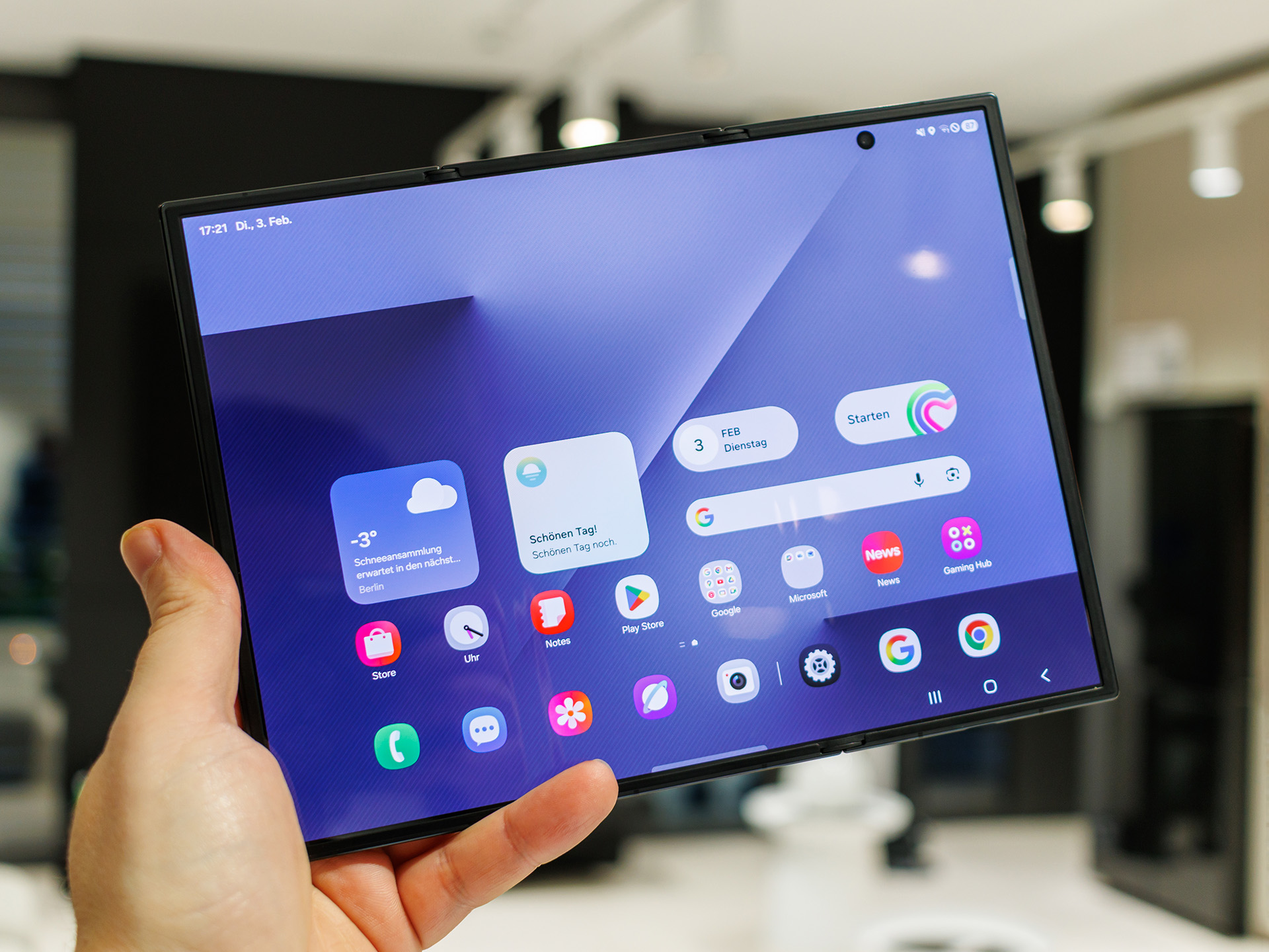 Im gefalteten Zustand liegt es noch halbwegs smartphone-typisch in der Hand, aufgeklappt entfaltet sich jedoch ein rund 10 Zoll großes Dynamic-AMOLED-2X-Panel mit hoher Auflösung und 120-Hz-Bildwiederholrate, das sich geradezu für Multitasking, kreatives Arbeiten und Medienkonsum anbietet. Ergänzt wird das Innendisplay von einem vollwertigen Cover-Screen, der im Alltag die klassische Smartphone-Bedienung ohne Klapp-Aktion ermöglicht und mit hoher Helligkeit sowie schneller Darstellung auch im Freien überzeugen soll.