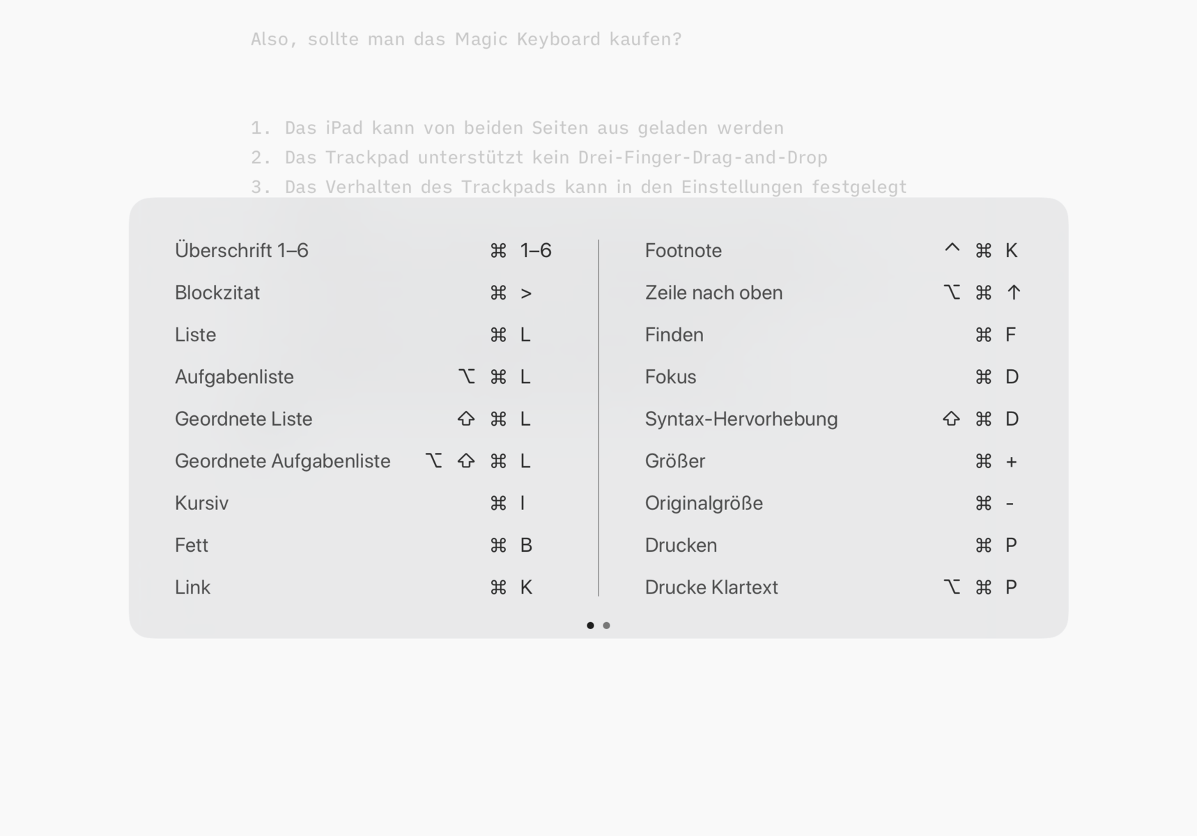 Um App-spezifische Tastenkombinationen zu sehen muss man lediglich die cmd-Taste einige Sekunden lang gedrückt halten, iPadOS blendet dann eine Übersicht ein. Doch auch viele systemweite Tastenkombinationen sind verfügbar, die man so schon von macOS kennt, wie etwa "Umschalt – cmd – 3" um einen Screenshot aufzunehmen.