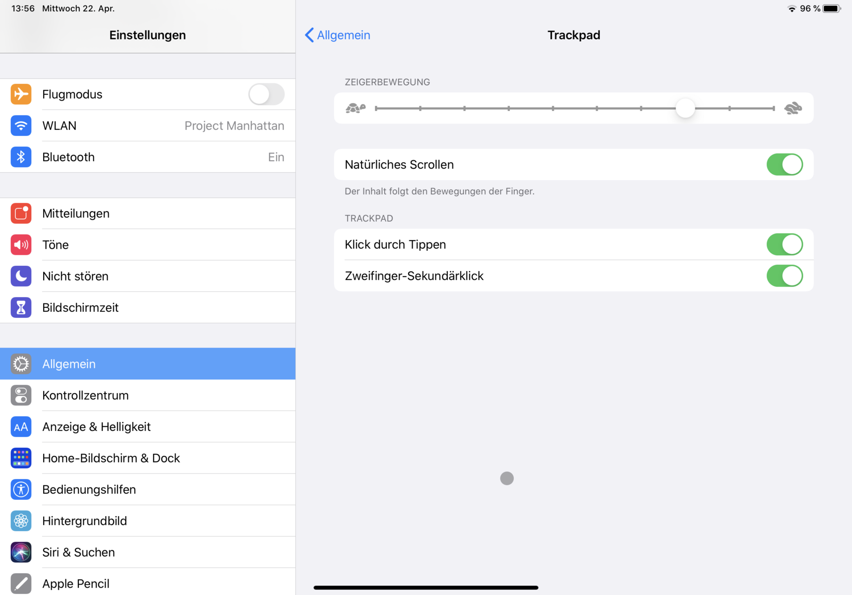 Ähnlich wie man das bereits von macOS kennt findet man in den Einstellungen unter Allgemein nun einen neuen Menüpunkt, über den grundlegende Einstellungen vorgenommen werden können, wie etwa die Geschwindigkeit des Mauszeigers, "Klicken durch Tippen" oder auch der Rechtsklick mit zwei Fingern. Eine wichtige Option fehlt aber leider ...