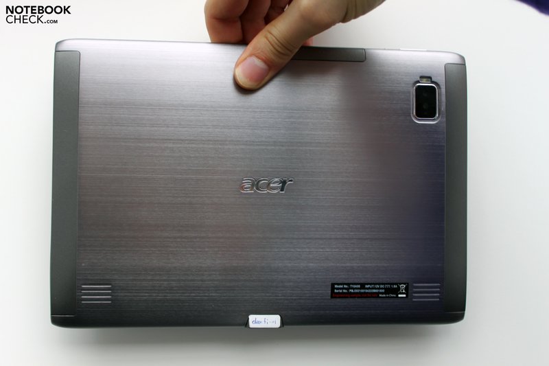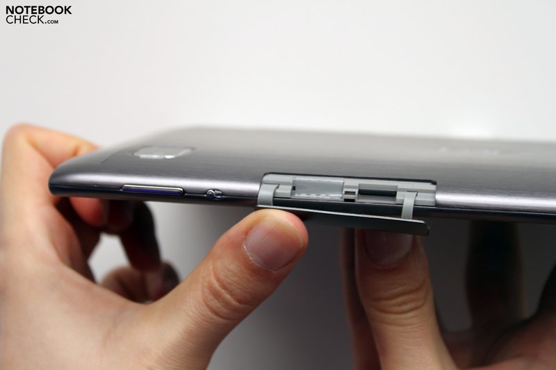 Positiv: Wie das Samsung Galaxy Tab bietet auch das Acer 10-Zoll Android Tablet an der Seitenkante eine Klappe mit Zugang zu Sim-Slot und MicroSD Speicherkartenslot.