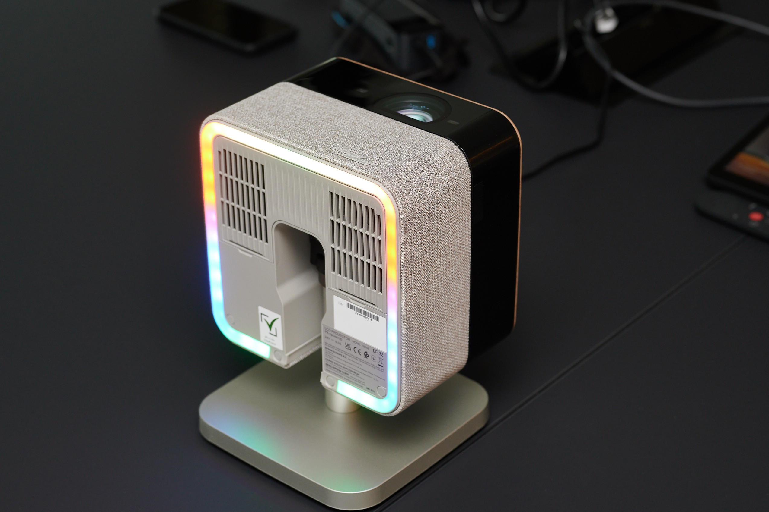 Interessant sind noch die Lichteffekte. Eine nette Spielerei, die auch gut aussieht. Zwar sind die einzelnen LEDs unter dem Diffusor wahrnehmbar, aber immerhin sind es keine spitzen Lichter und in der Normalposition des Projektors fällt das ohnehin nicht auf..