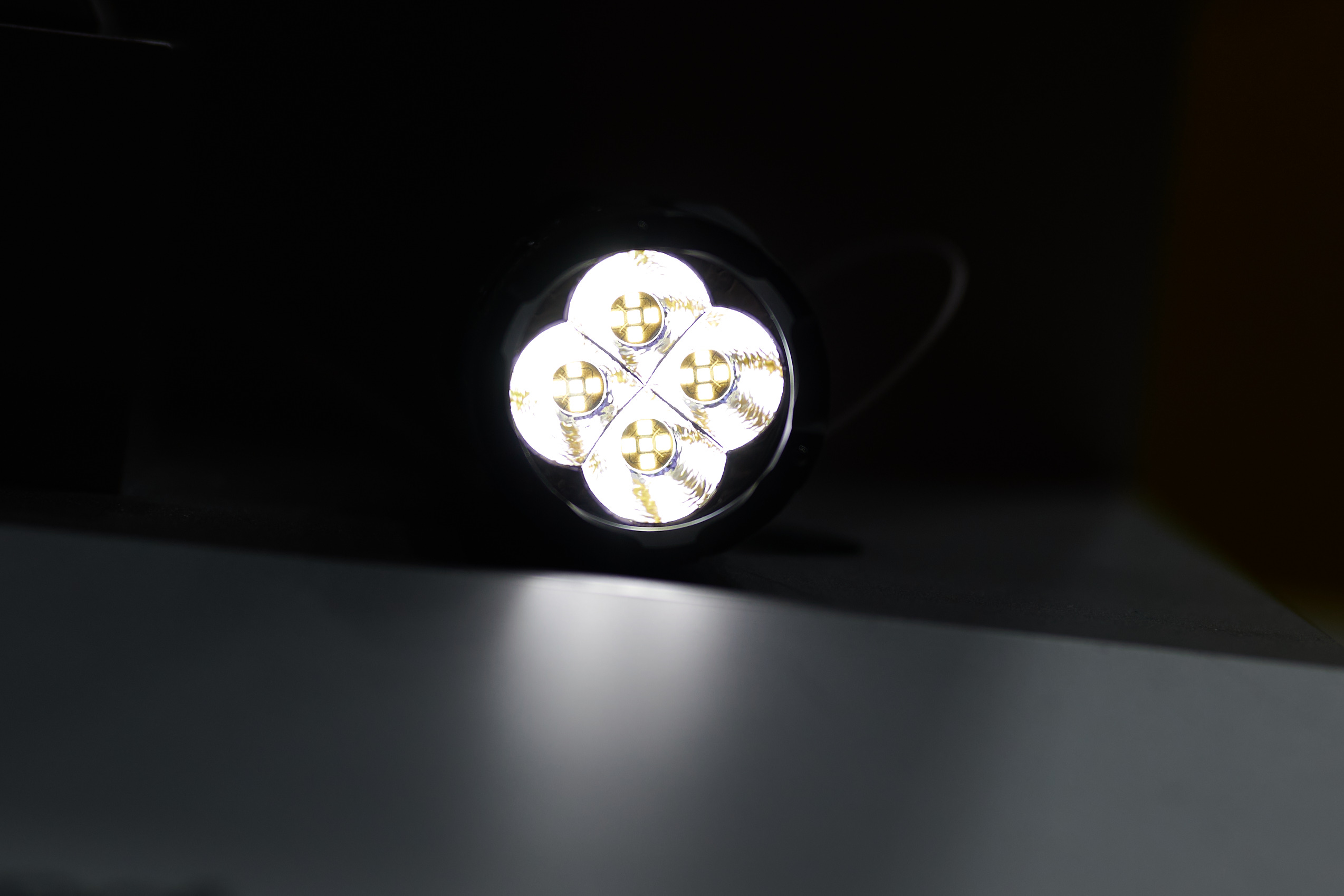 Da die Taschenlampe im Betrieb zu hell ist, konnten wir uns die Kernkonfiguration nur im abgeschalteten oder dunklen Modus anschauen. Nitecore arbeitet hier mit fünf anscheinend ähnlichen Kernen, um die jeweils unterschiedlichen Lichtkonfigurationen umzusetzen. Die werden dann bedarfsgerecht verstärkt. Der innere Kern wirkt dabei auf uns etwas kleiner.