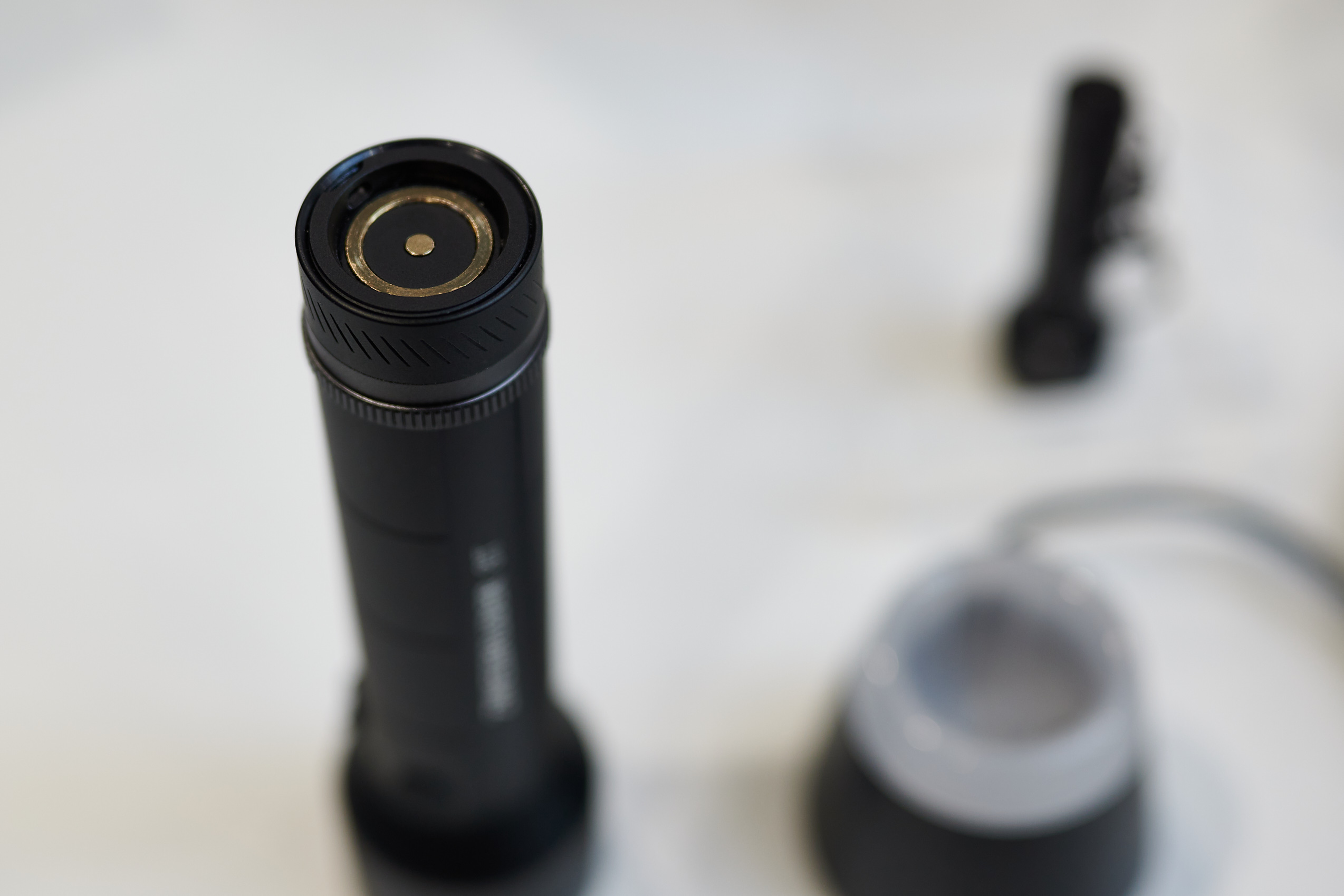 Zusätzlich kommt die Taschenlampe mit einem praktischen Dock. Zwar kann sie vorne am Kopf per USB Typ C aufgeladen werden und die Buchse ist mit einer Schiebetür geschützt. Doch einfacher ist das Einstecken in das Dock, das auch recht schwer und damit stabil wirkte. Dafür gibt es keinen Leuchtring am Taschenlampenende und der Akku verbleibt normalerweise in der Taschenlampe.