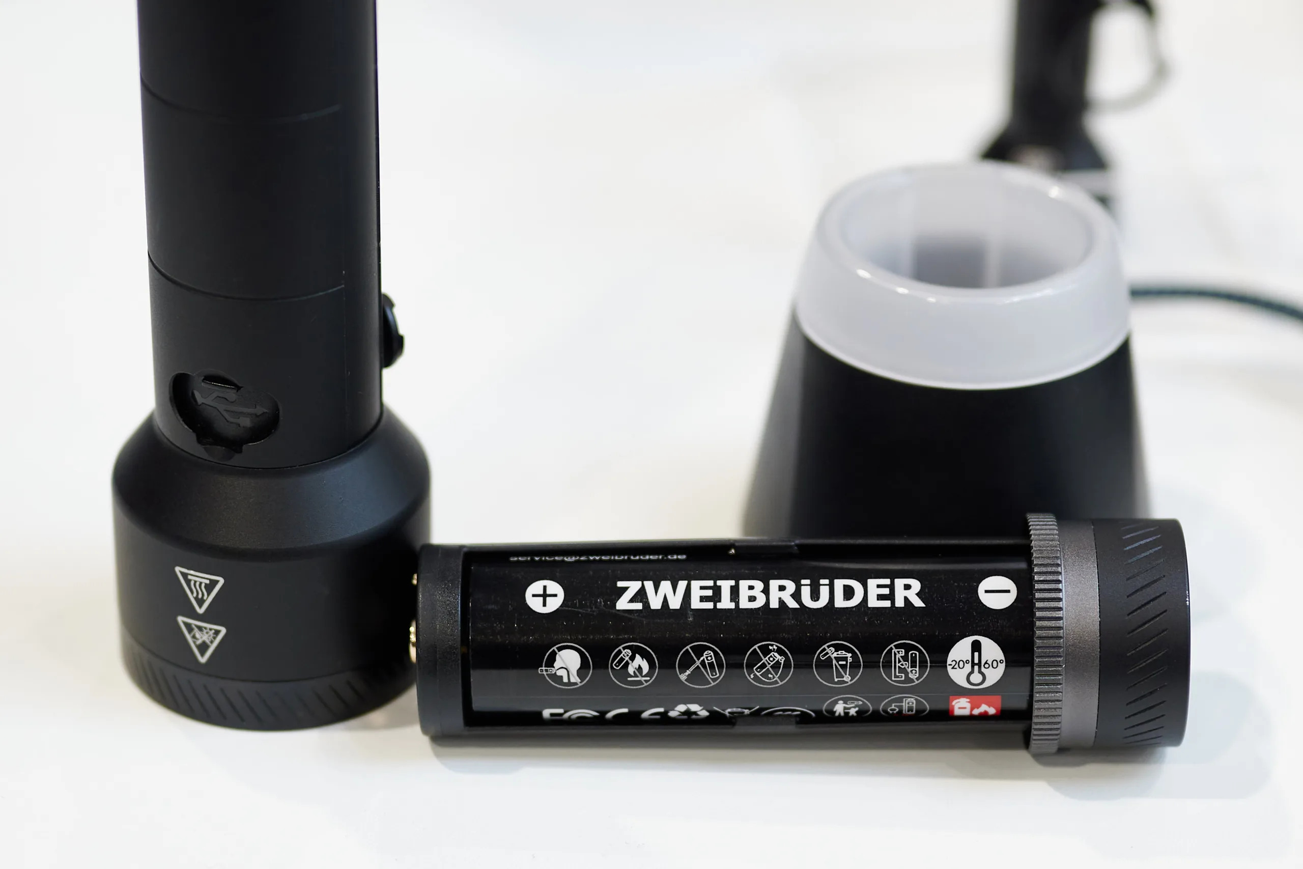 Interessant ist auch der geschützte Ladeport hinten an der Taschenlampe, was uns spontan an unsere Pelican 5050R erinnerte. Als Besonderheit kann der Akku auch aufgeladen werden, ohne in der Taschenlampe zu stecken, da die Ladeeinheit samt Akkufassung abnehmbar ist. Ein Leuchtring am Ende gibt den Ladestatus wieder. Es gibt aktuell aber kein Zubehör, um sich eine zweite Einheit zu kaufen. Zubehör fehlt allgemein bei Zweibrüder.
