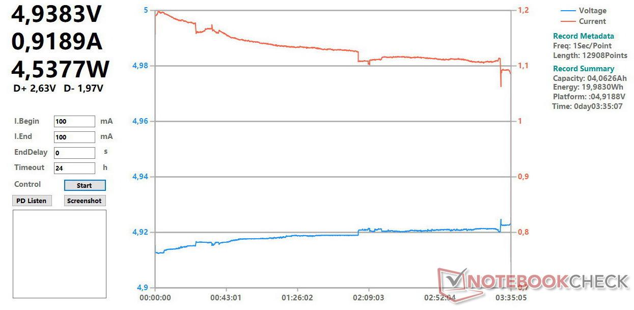 Laut dodocool unterstützt die DP13 nur zwei Ladegeschwindigkeiten für das Auftanken der Power-Bank, auch wenn bei den Specs für den PD-Eingang unterschiedliche Eingangsparameter angegeben werden. Laut dem Herstellersupport erfolgt eine Normalladung bei (bis zu) 5 V/2,1 A und eine Schnellladung entsprechend mit 20 V/1,5 A. Bei unserem Kurztest schafften wir es nicht, trotz unterschiedlicher Premiumkabel (USB-C-auf-USB-A) und verschiedener Ladegeräte mit Typ-A-Buchse, die unterschiedliche Ladetechniken wie Quick Charge etc. beherrschen, über 10 Watt (5 V/2 A o.e.) zu kommen. Entsprechend lange dauerte das Aufladen. 11 Stunden 36 Minuten verstrichen, bis die DP13 wieder voll aufgeladen war. Das Akku-Pack genehmigte sich laut Protokoll 18.645 mAh (93,38 Wh). @3,6 V wären dies 25.896 mAh. Die kürzeste gemessene Aufladung über USB-C/USB-A lag bei knapp 10 Stunden (9:55 Std.) mit 17.987 mAh (@3,6 V: 24.982 mAh) respektive 90,408 Wh.