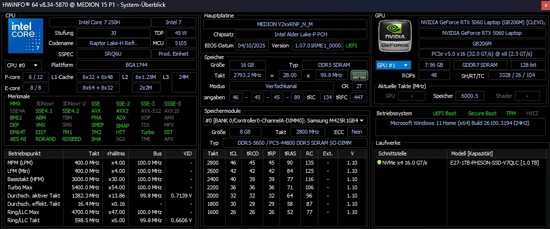 | Medion Erazer Deputy 15 P1 MD62761 Intel Core 7 250H ⎘ NVIDIA GeForce RTX 5060 Laptop ⎘ 16 GB RAM, 1024 GB | Amazon: Bestpreis 1299€ nullprozentshop.de 2. 1299€ Coolblue 3. 1299€ notebooksbilliger.de | 2.2 kg | 29 mm | 15.60" 1920x1080 141 PPI IPS | |