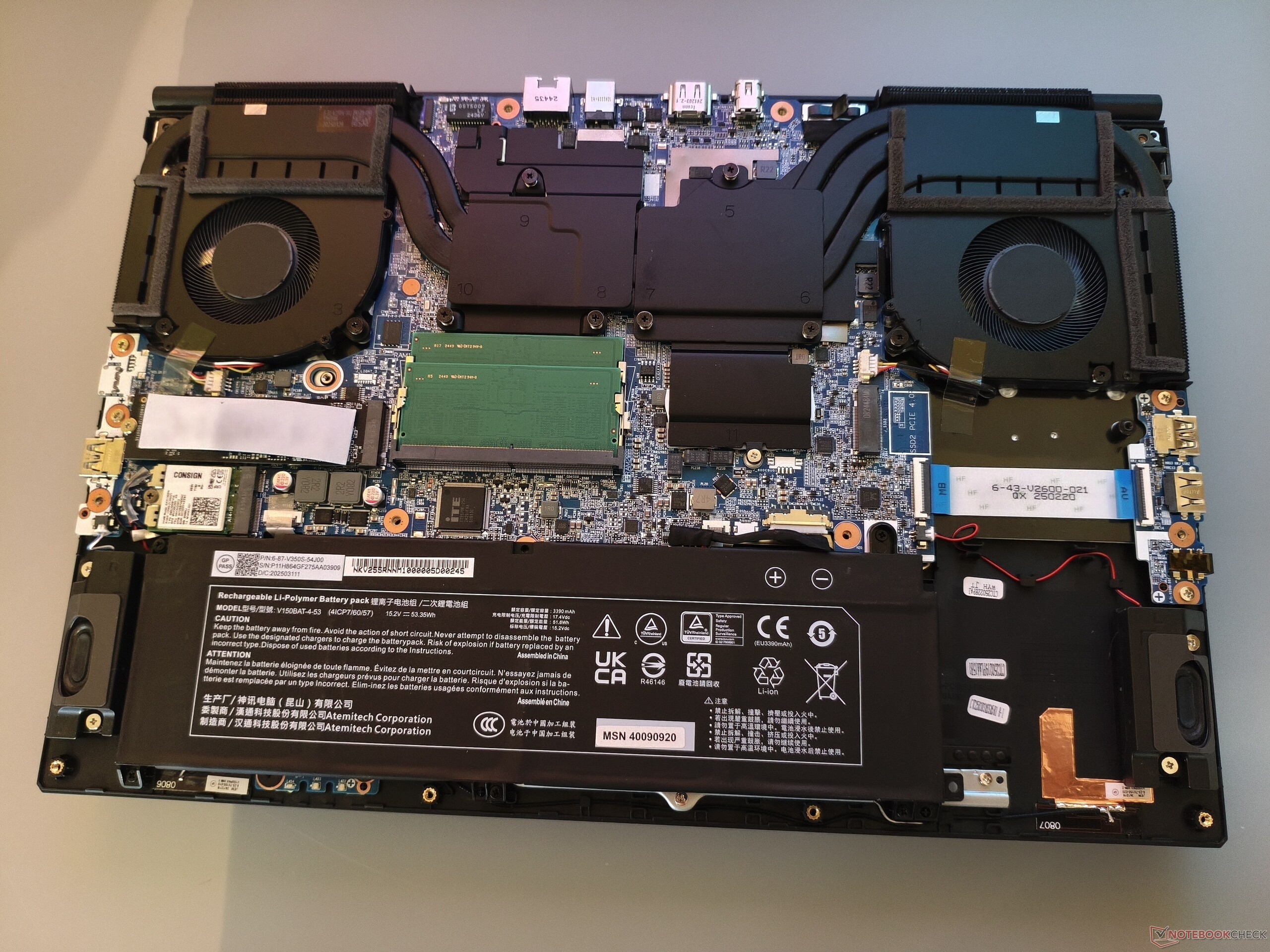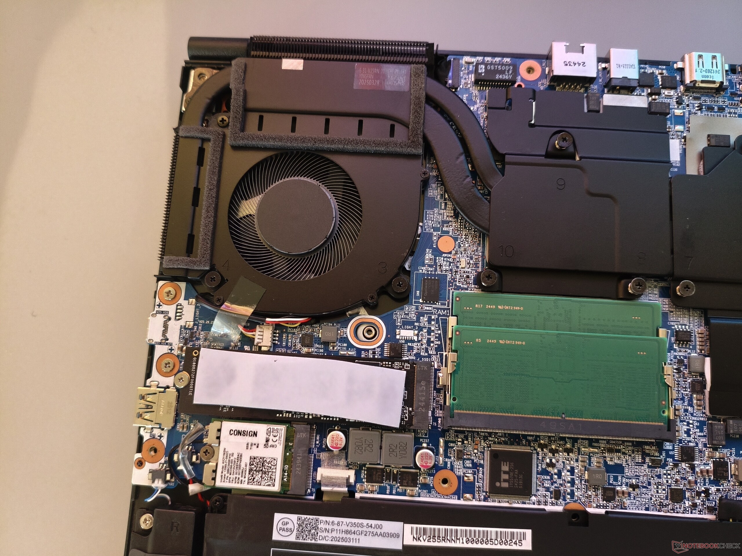 Wenn man den Verzicht auf USB 4 bzw. Thunderbolt und einen Cardreader ausklammert, ist die Anschlussausstattung mehr als solide. So kann der 15-Zoll-Spross mit drei USB-A-Ports, einem Typ-C-Port, einer Audio-Buchse, einem RJ45-Port und einer Öffnung für Kensington Locks aufwarten. Externe Bildschirme lassen sich direkt per HDMI oder Mini-DisplayPort verbinden. Das Funkmodul von Intel (Modell AX211) liefert eine gute bis sehr gute Vorstellung ab, was man von der Webcam nicht behaupten kann (magere Bildschärfe). Die Bodenplatte lässt sich nach dem Lösen von 13 Kreuzschrauben entfernen. Wie Sie auf den Fotos weiter unten sehen, bietet das Deputy 15 P1 jeweils zwei RAM- und SSD-Slots, was Lob verdient.