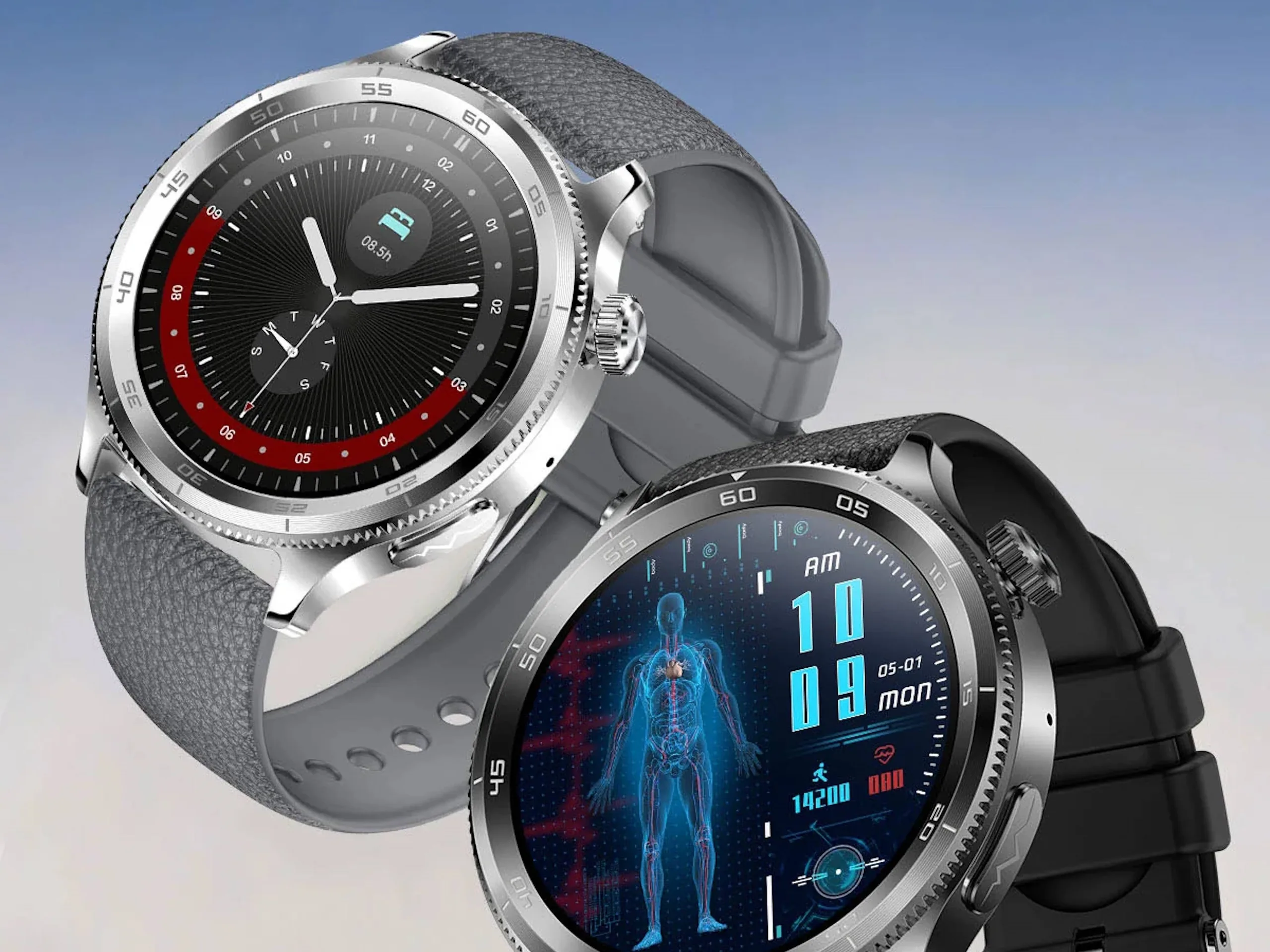 Zumindest die EKG-Sensorik - ein solcher Messaufbau ist im Grunde nicht sonderlich komplex und die Messung selbst als tendenziell eher robust zu bezeichnen - könnte aber funktionieren. Die Messung der Herzfrequenz wird ebenso beworben wie der Sauerstoffsättigung und auch der Herzfrequenz. Bei der rein optischen Messung des Blutdrucks ohne Stützkalibrierung dürfte es sich ebenfalls um eine Ente handeln - Smartwatches mit Unterstützung zur Blutdruckmessung gibt es aber auch mit Zertifizierung (im Preisvergleich). Beworben wird eine IP68-Zertifizierung, verbaut ist ein 1,43 Zoll großer AMOLED-Bildschirm, die Uhr kann nicht nur über den Bildschirm, sondern auch eine drehbare Krone gesteuert werden. Ein GNSS-Modul fehlt, angegeben wird eine typische Akkulaufzeit von bis zu einer Woche.
