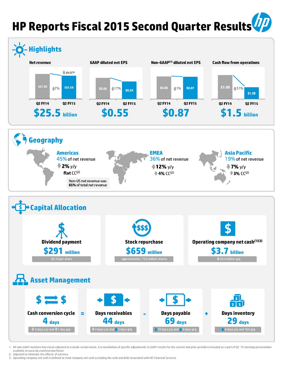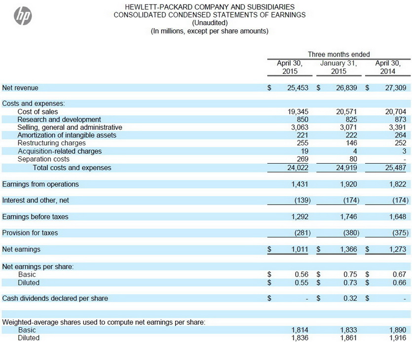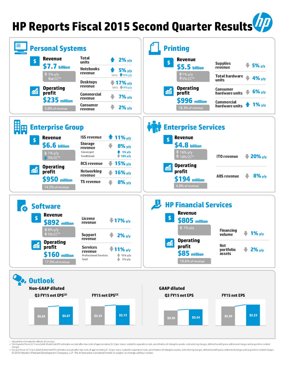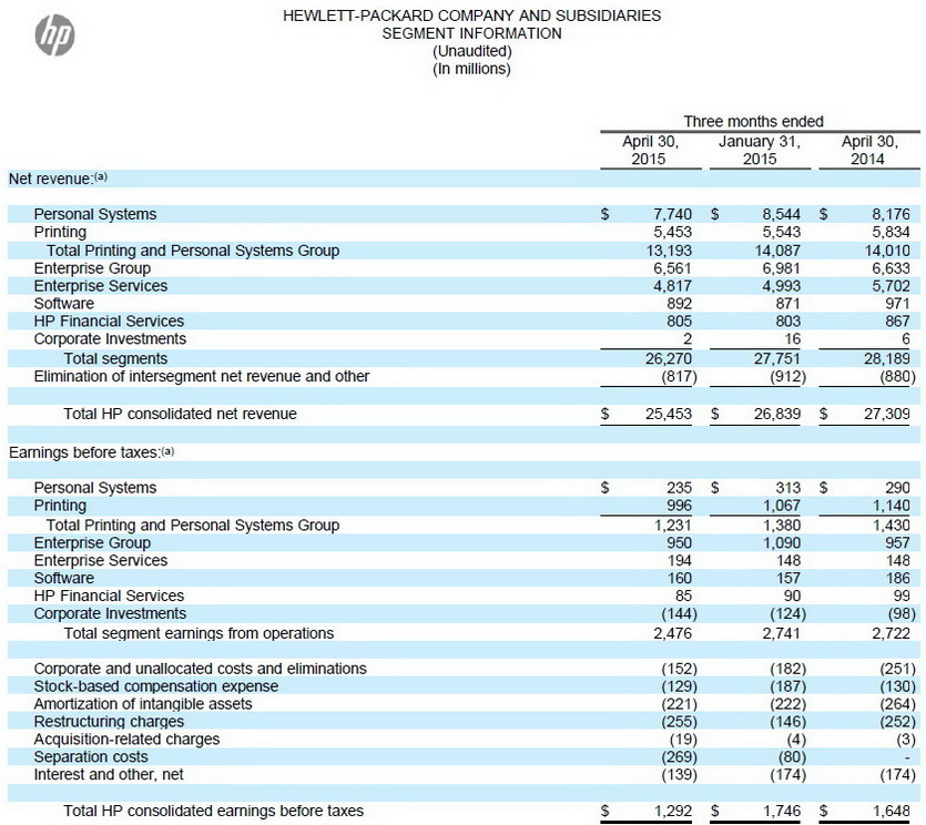 Vor der geplanten Aufspaltung in Hewlett-Packard Enterprise und HP Inc. musste der IT-Konzern Hewlett-Packard (HP) mit den Ergebnissen aus dem 2. Fiskalquartal 2015, das zum 30. April 2015 endete, einen deutlichen Rückgang bei Umsatz und Gewinn bekannt geben. Wie HP mitteilte, sackte der Umsatz des Branchenriesen von 27,309 Milliarden US-Dollar um knapp 6,8 Prozent auf 25,453 Milliarden ab. Der Nettogewinn reduzierte sich von 1,273 Mrd. auf 1,011 Milliarden Dollar (minus 20,6 Prozent).