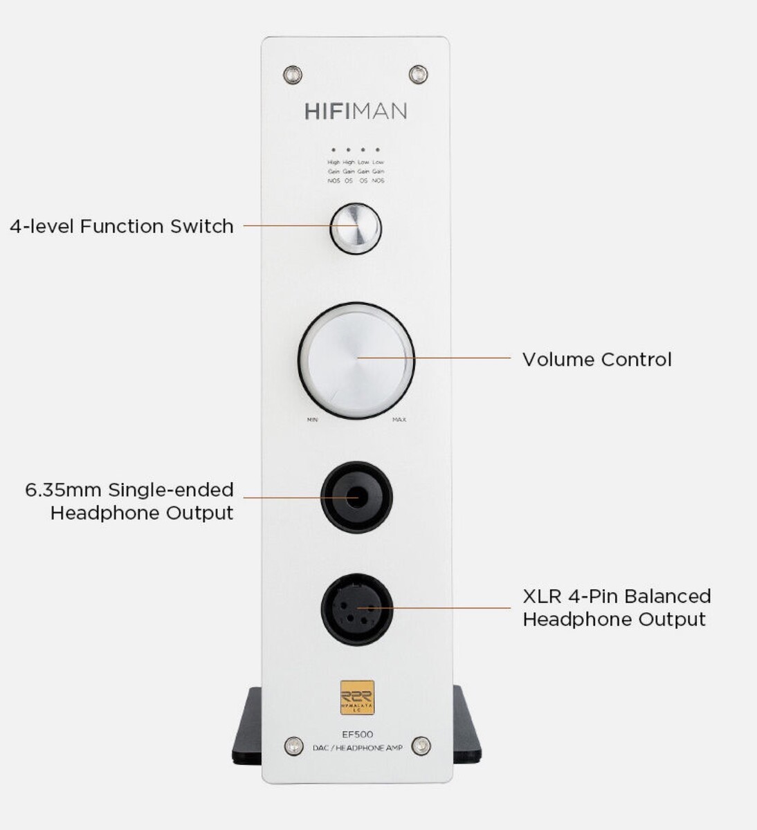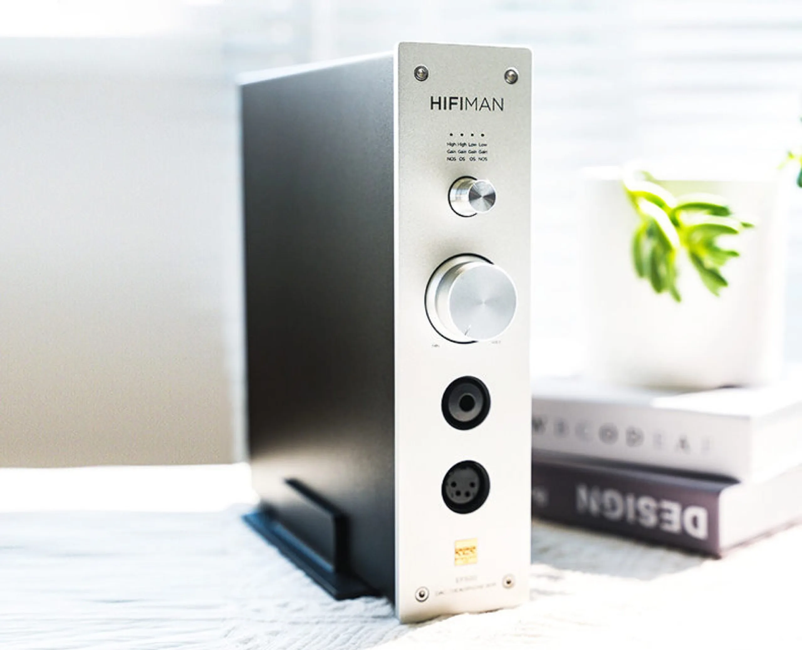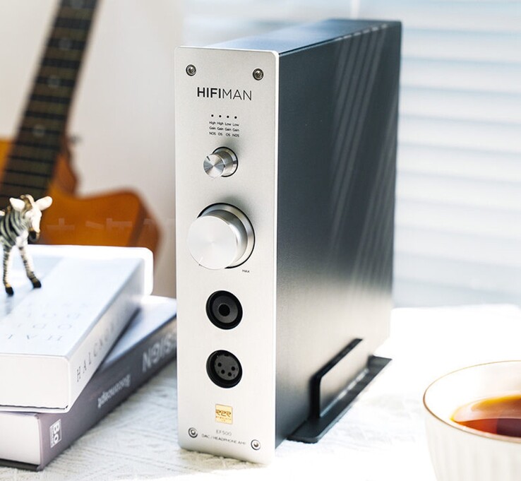 Das 3,37 Kilogramm schwere Metallgehäuse besitzt einen großen Lautstärke-Drehregler an der Front sowie ein Modus-Wahlrad, das von Low Gain auf High Gain umschalten kann, um die passende Einstellung für den aktuell verwendeten Kopfhörer anwenden zu können. Das längliche Design soll nicht nur Platz auf dem Schreibtisch sparen, sondern den HiFiMan EF500 zeitgleich zu einem Kopfhörer-Ständer machen.