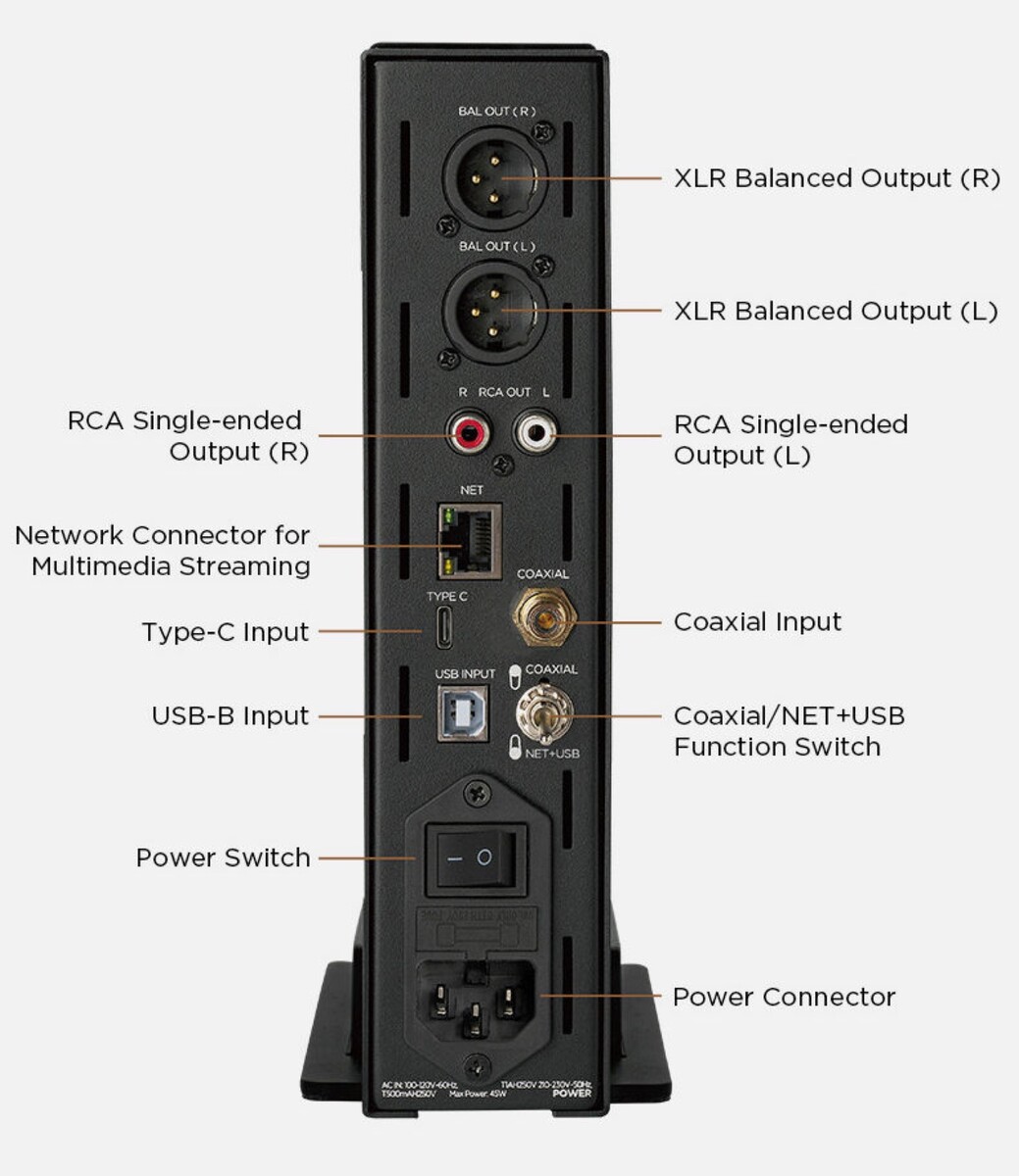 Der HiFiMan EF500 wird als hochwertiger Kopfhörer-Verstärker für den Schreibtisch vermarktet, wofür das Gerät direkt über USB-C mit einem Computer verbunden werden kann. Alternativ steht auch ein Ethernet-Anschluss zur Verfügung, wodurch Musik in Verbindung mit einer Smartphone- oder Tablet-App direkt von Streaming-Diensten oder von einer Musikbibliothek auf einem NAS gestreamt werden kann.