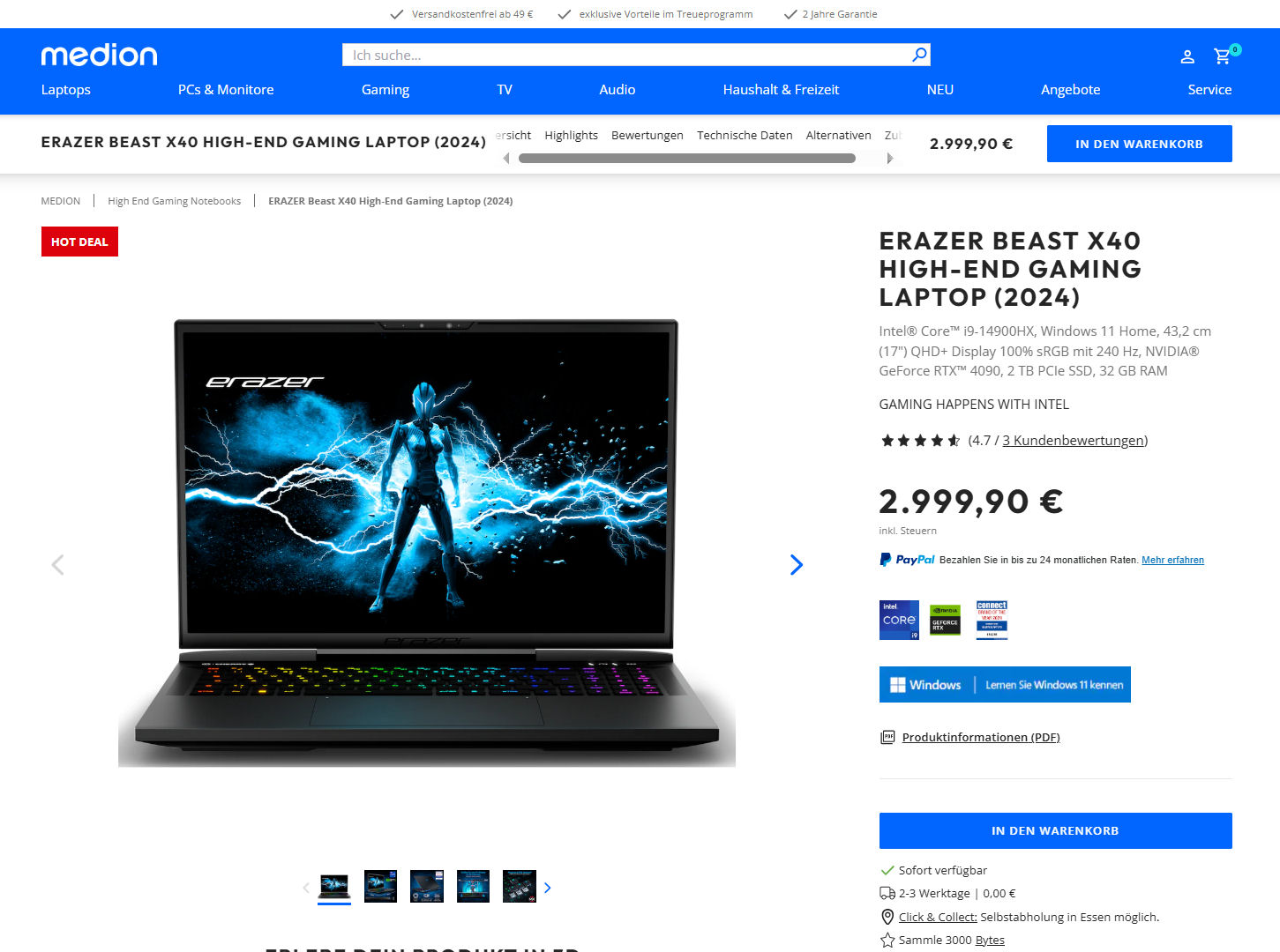 Das Preisniveau ist im Laufe der vergangenen 12 Monate von knapp 4.000 Euro auf knapp 3.000 Euro gesunken: Aktuell führt der Medion-Onlineshop den Rechner zu einem Preis von 2.999,90 Euro im Sortiment. Es handelt sich hierbei um die von uns im letzten Jahr getestete Ausstattungsvariante. Der Rechner ergatterte die Bewertung „Sehr Gut (89 %)“.
