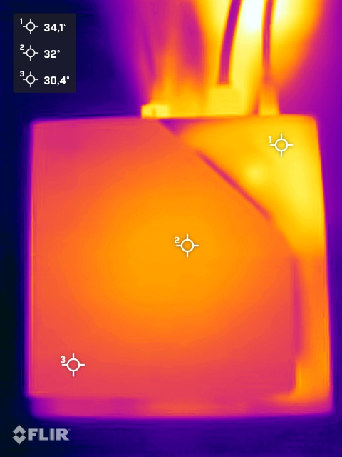 (-) Auf der Unterseite messen wir eine maximalen Wert von 48.5 °C (im Vergleich zum Durchschnitt von 36.5 °C).