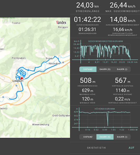 Per Smartphone und der App Geo Tracker wurden Höchstgeschwindigkeit und Reichweite bestimmt. In der bergigen Steiermark kommen so circa 24 km ununterbrochener Fahrt zusammen. Die per GPS ermittelte Höchstgeschwindigkeit auf ebenem Grund lag mit gut 23 km/h etwas unter den Herstellerangaben. Dafür schafft der Roller auch mehr als 20 % Steigung, erst bei über 40 % merkt man deutlich, wie sich der Motor quält. Hier muss festgehalten werden, dass die Reichweitenangabe des Herstellers von 30 bis 35 km sich auf eine Fahrt bei 18 km/h bezieht. Auch die Gewichtsbelastung des Rollers war durch den Autor eventuell höher als die, mit welcher Himo die Reichweite getestet hat. Einzig auf den letzten 2 Kilometern merkt man den deutlichen Abfall der Akkuleistung. Hier konnte der Elektroroller seine Maximalgeschwindigkeit nicht mehr halten. 200 Meter vor dem Ziel gab er dann letztlich ganz auf, und schaltete ab.