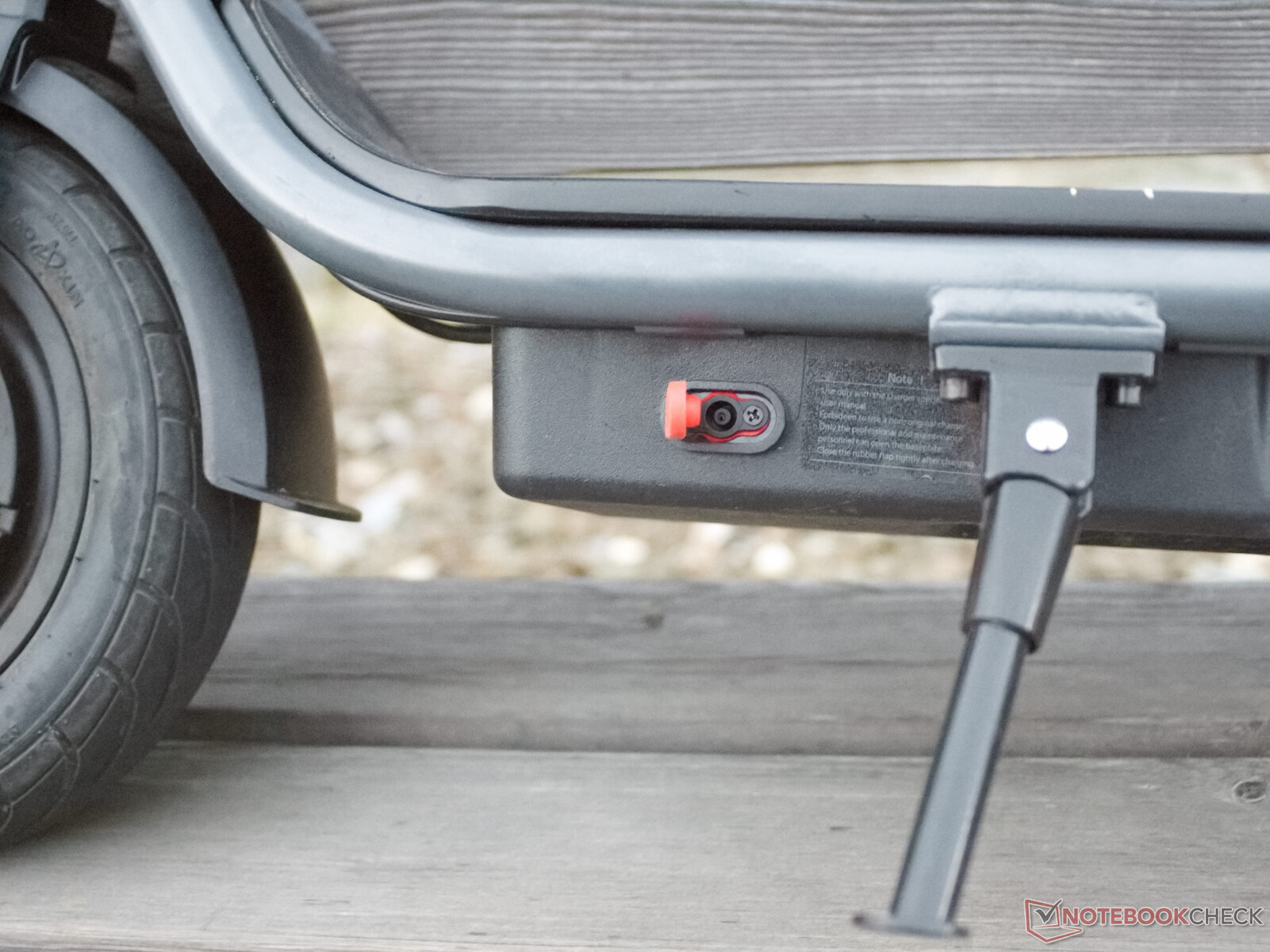 Geladen wird der Elektroroller mittels des beigelegten Netzteils. Dieses lädt den 36 V Akku mit 10,4 Ah innerhalb von fünf bis sechs Stunden bei maximal 84 Watt. Etwas ungünstig liegt hier der Ladeanschluss. Dieser befindet sich direkt neben dem Ständer unter einer roten Gummiabdeckung. Damit ist die Ladebuchse leider recht schwer erreichbar.